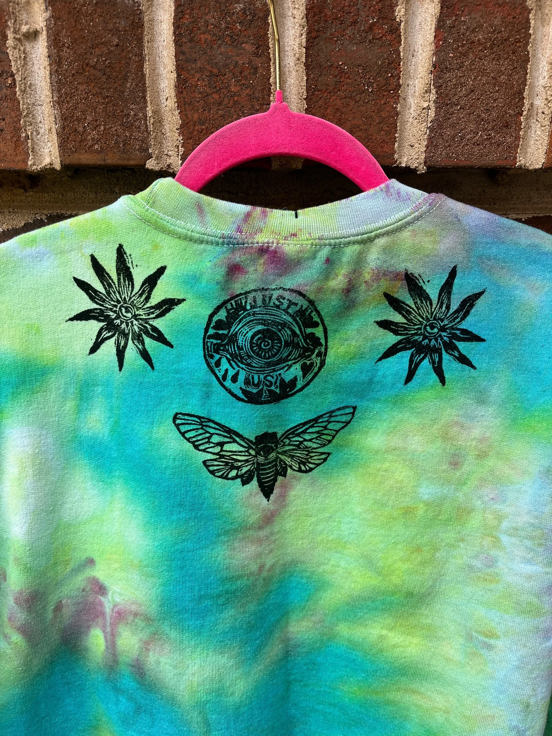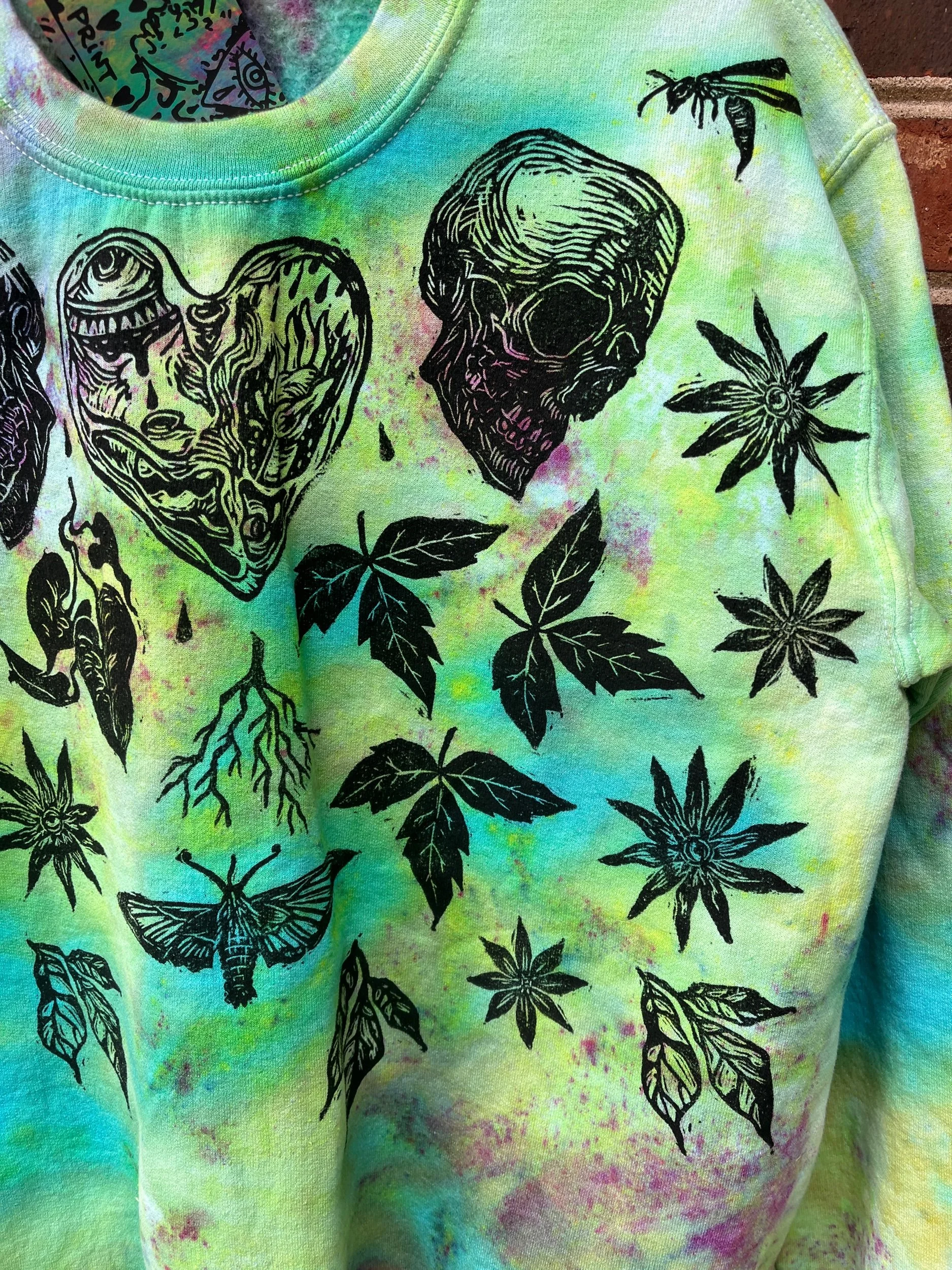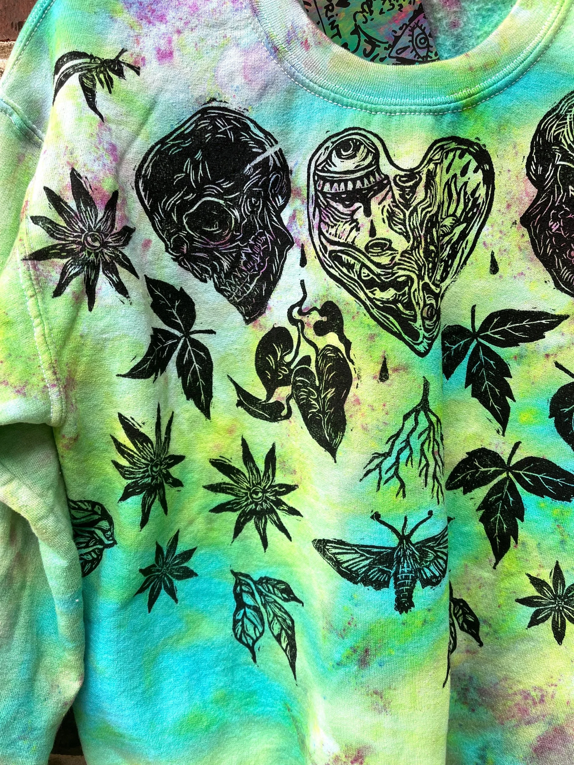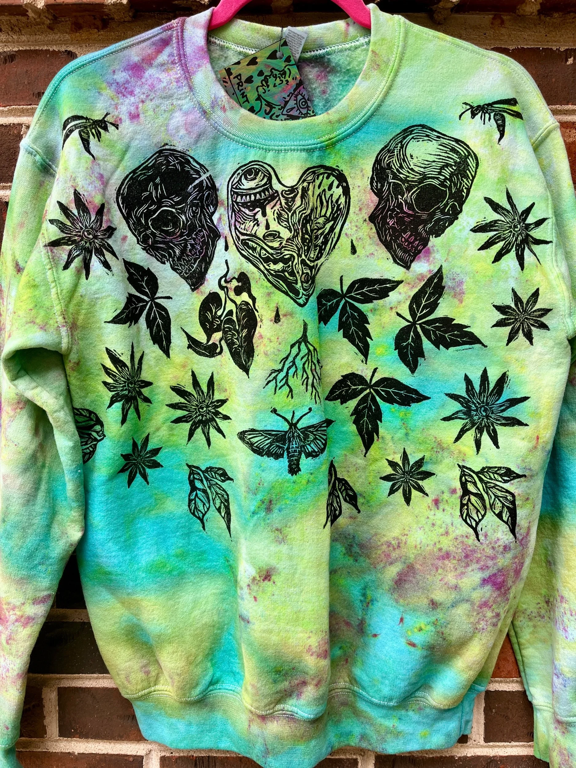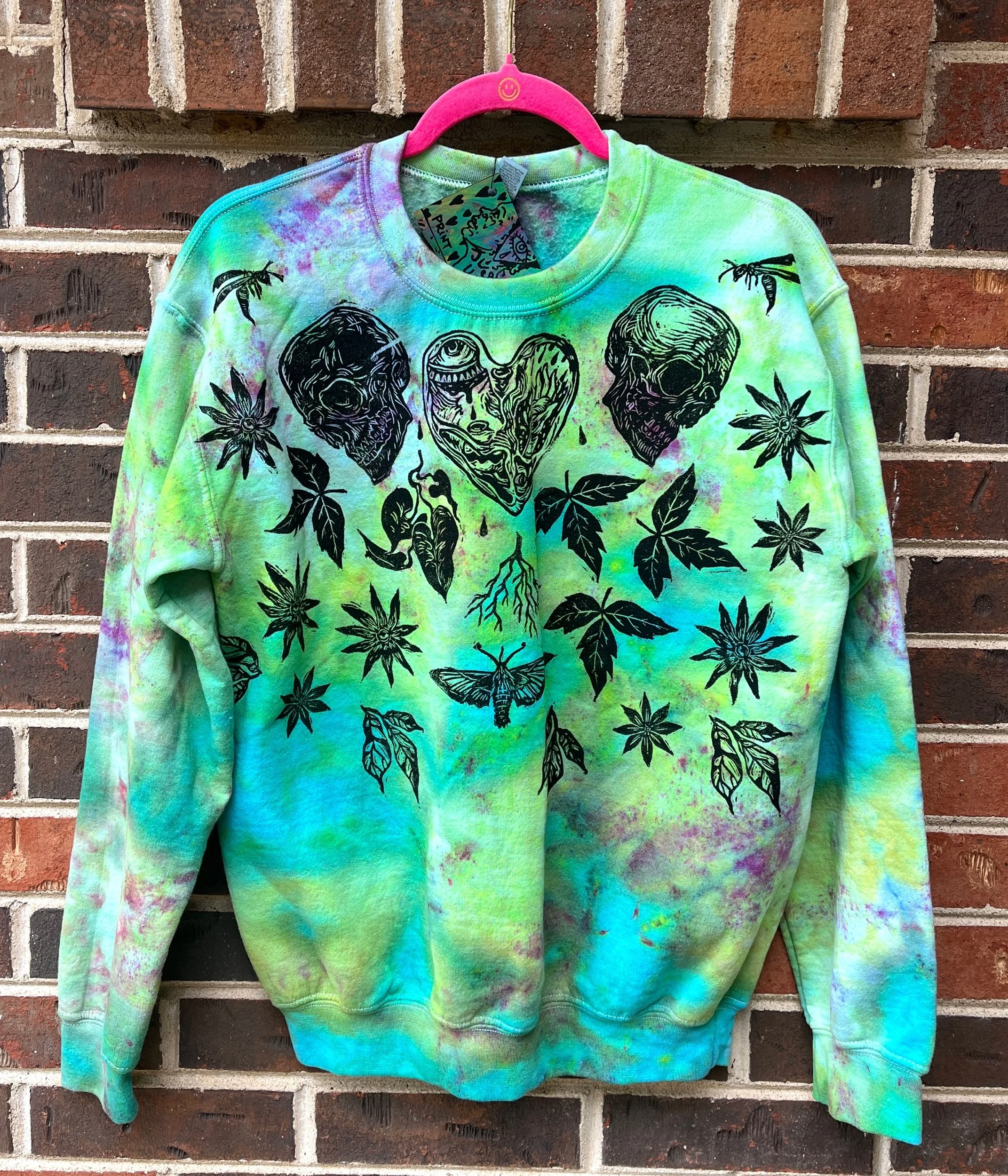 Hand stamped and ice-dyed cotton-poly sweatshirt, size Small.