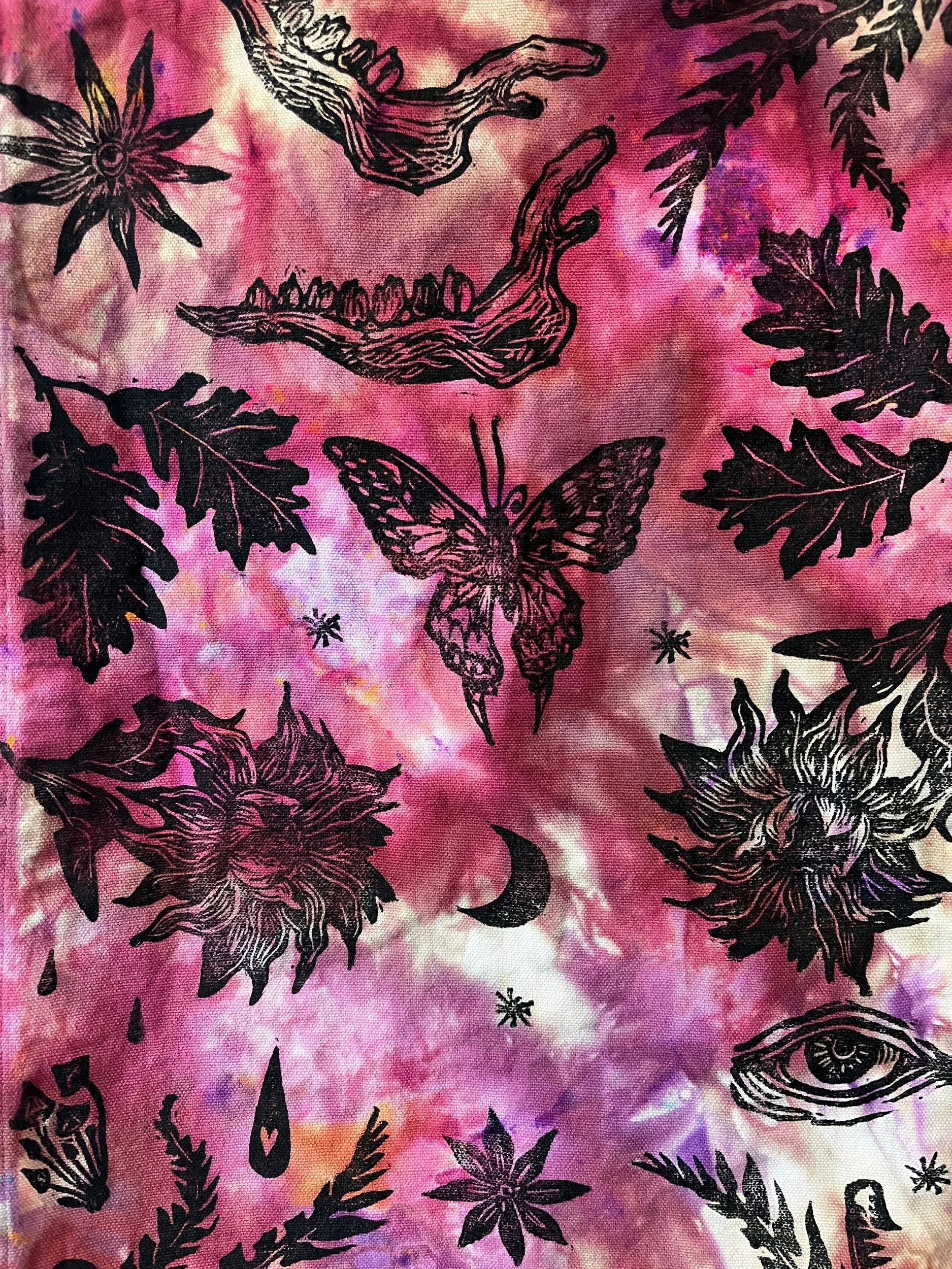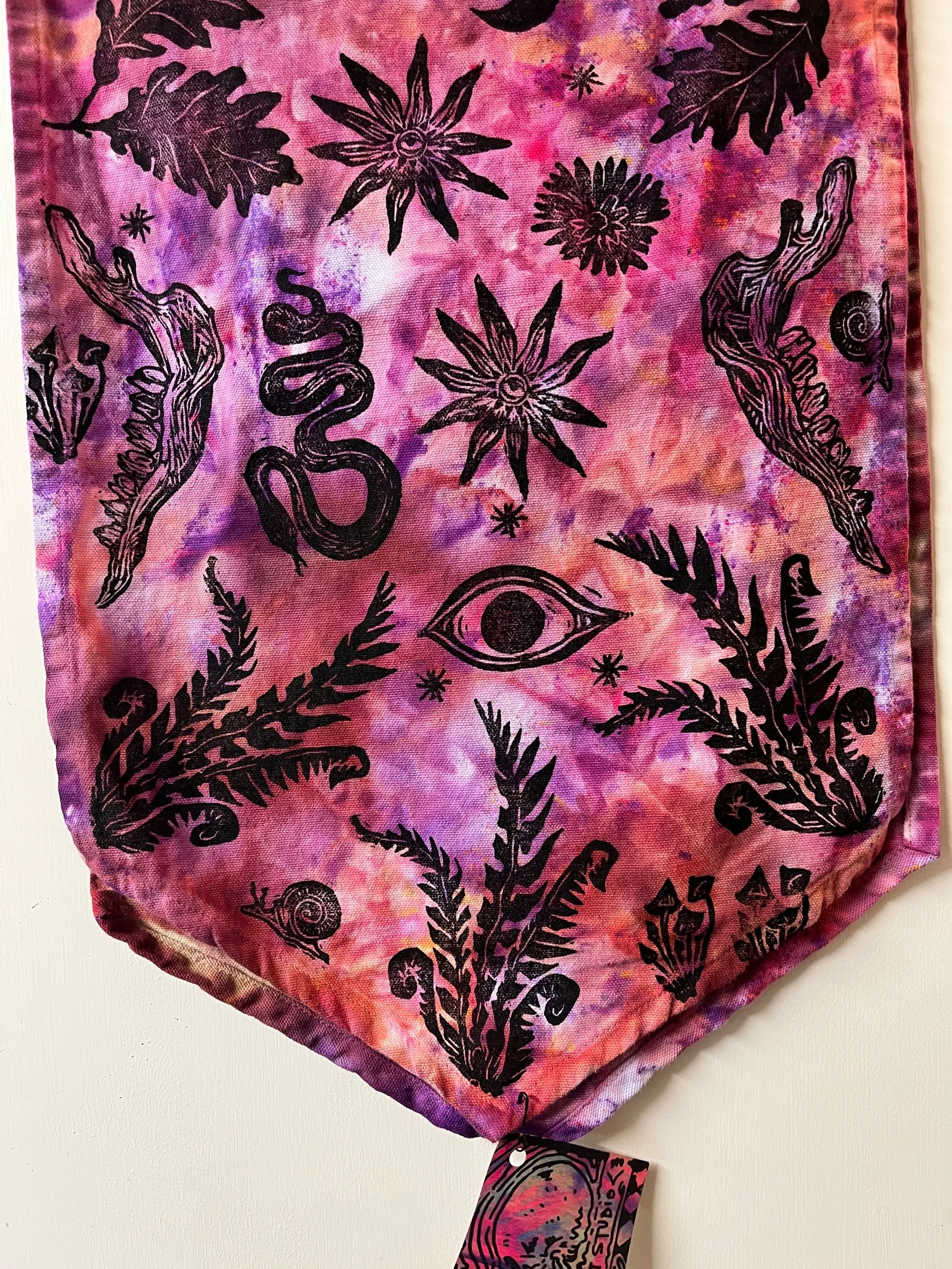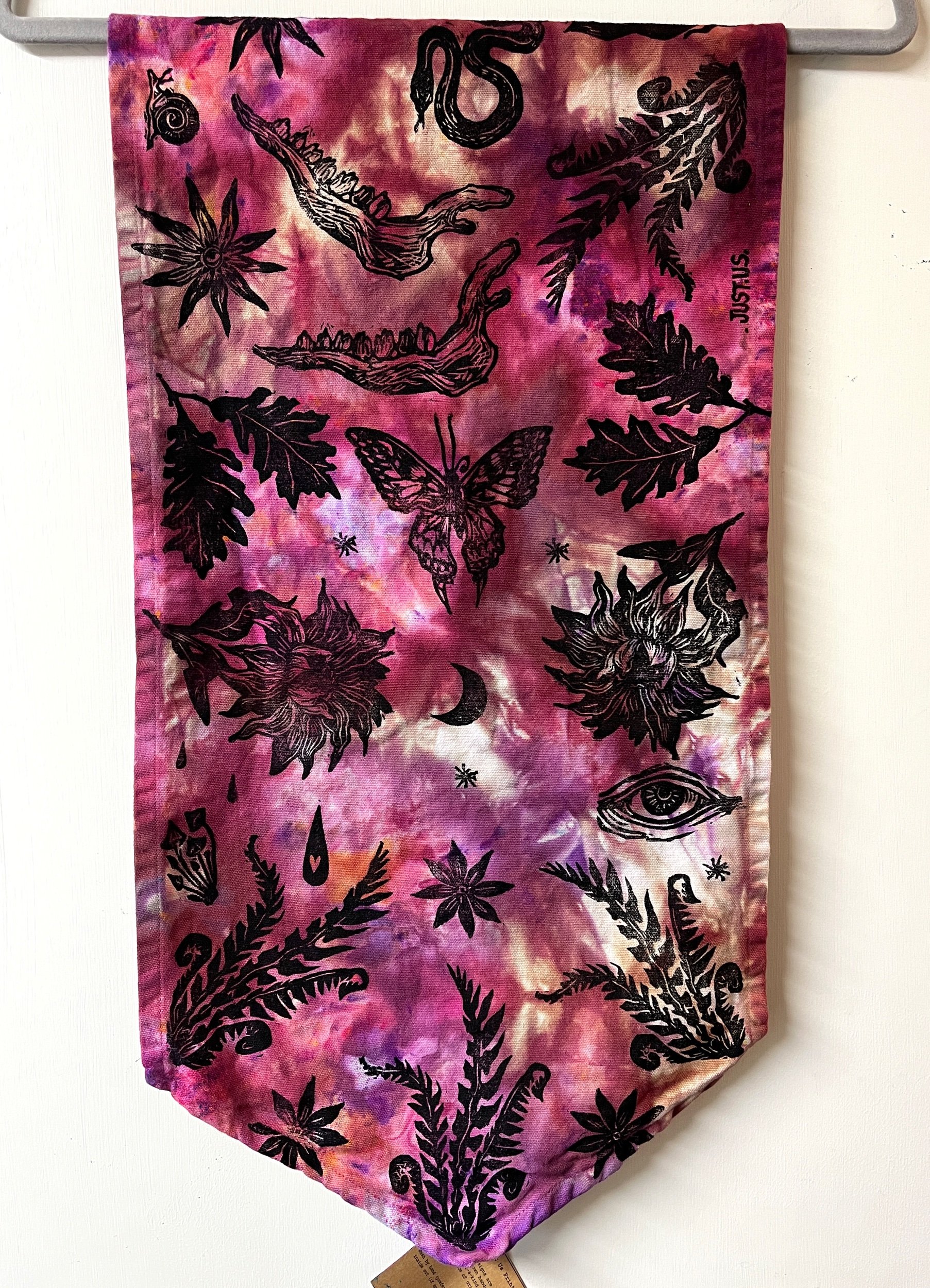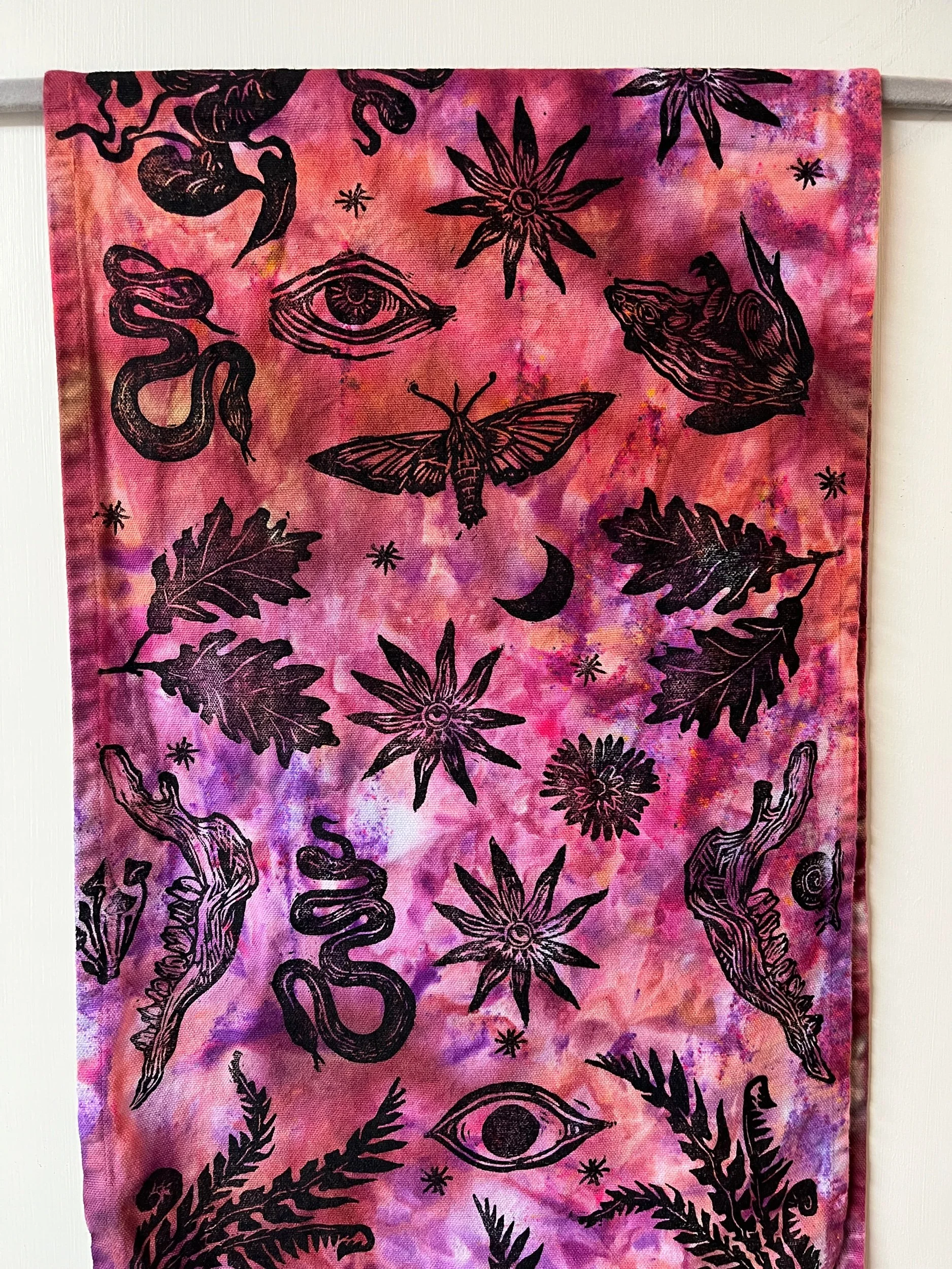 One-of-a-kind, hand stamped and ice-dyed cotton table runner. This piece makes for a beautiful table runner or altar cloth, and also looks great hung on a wall or over a doorway! Measures at around 12 x 48 in. *each piece may vary slightly!
