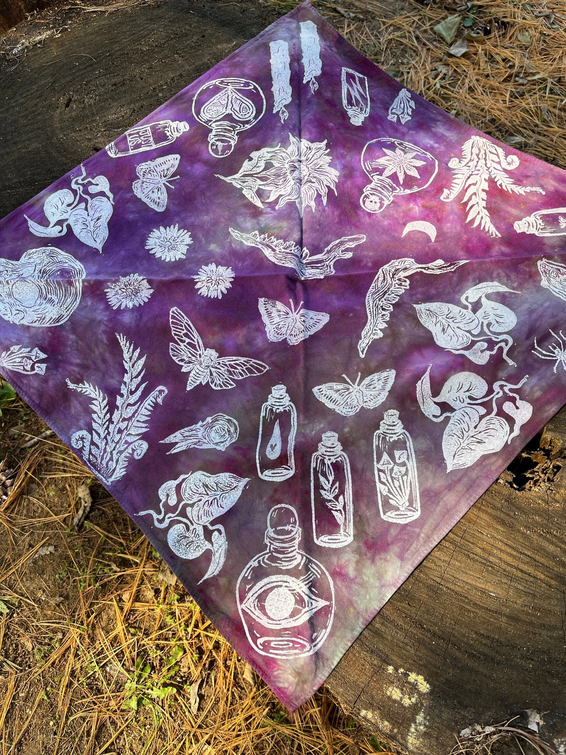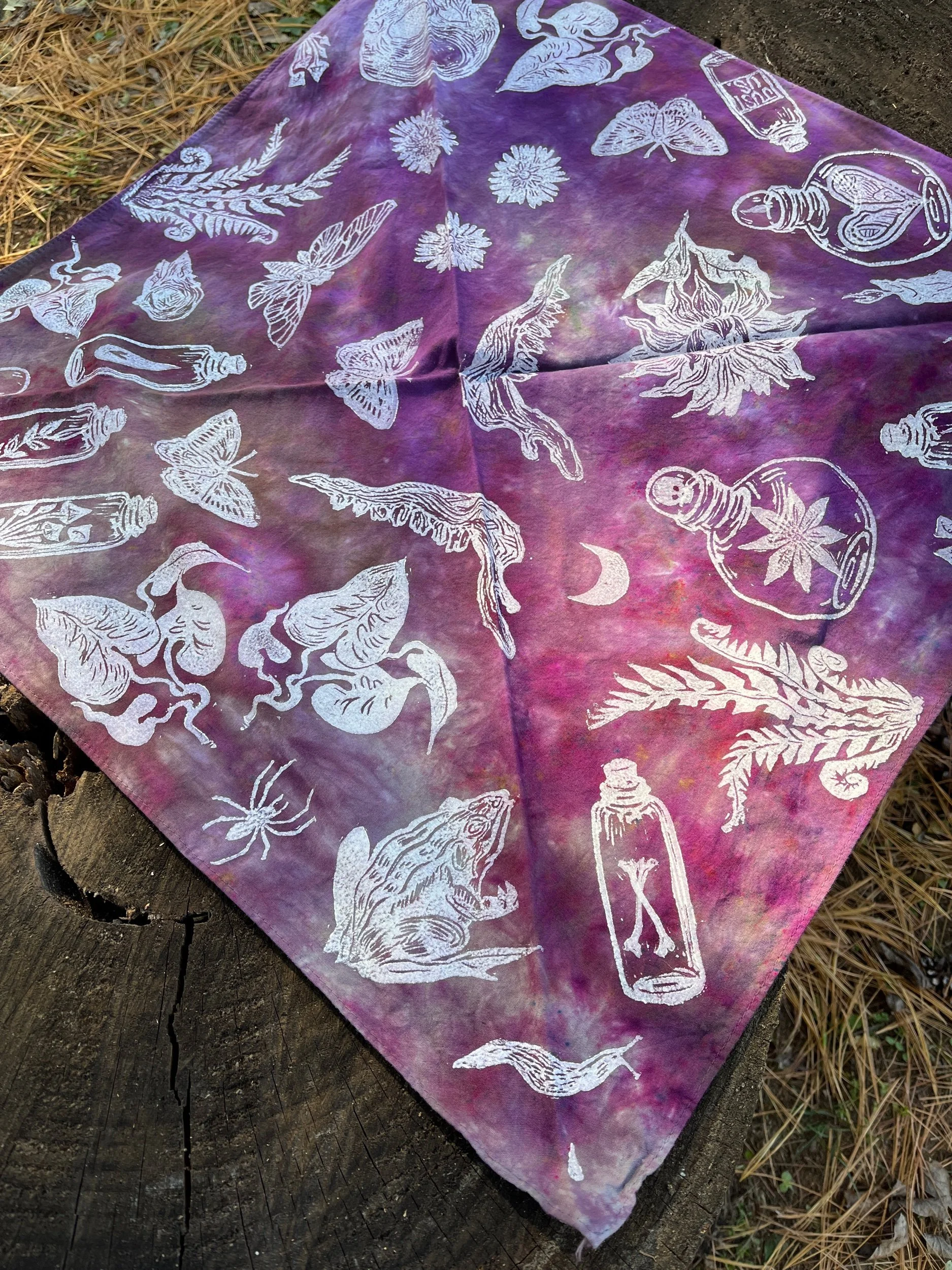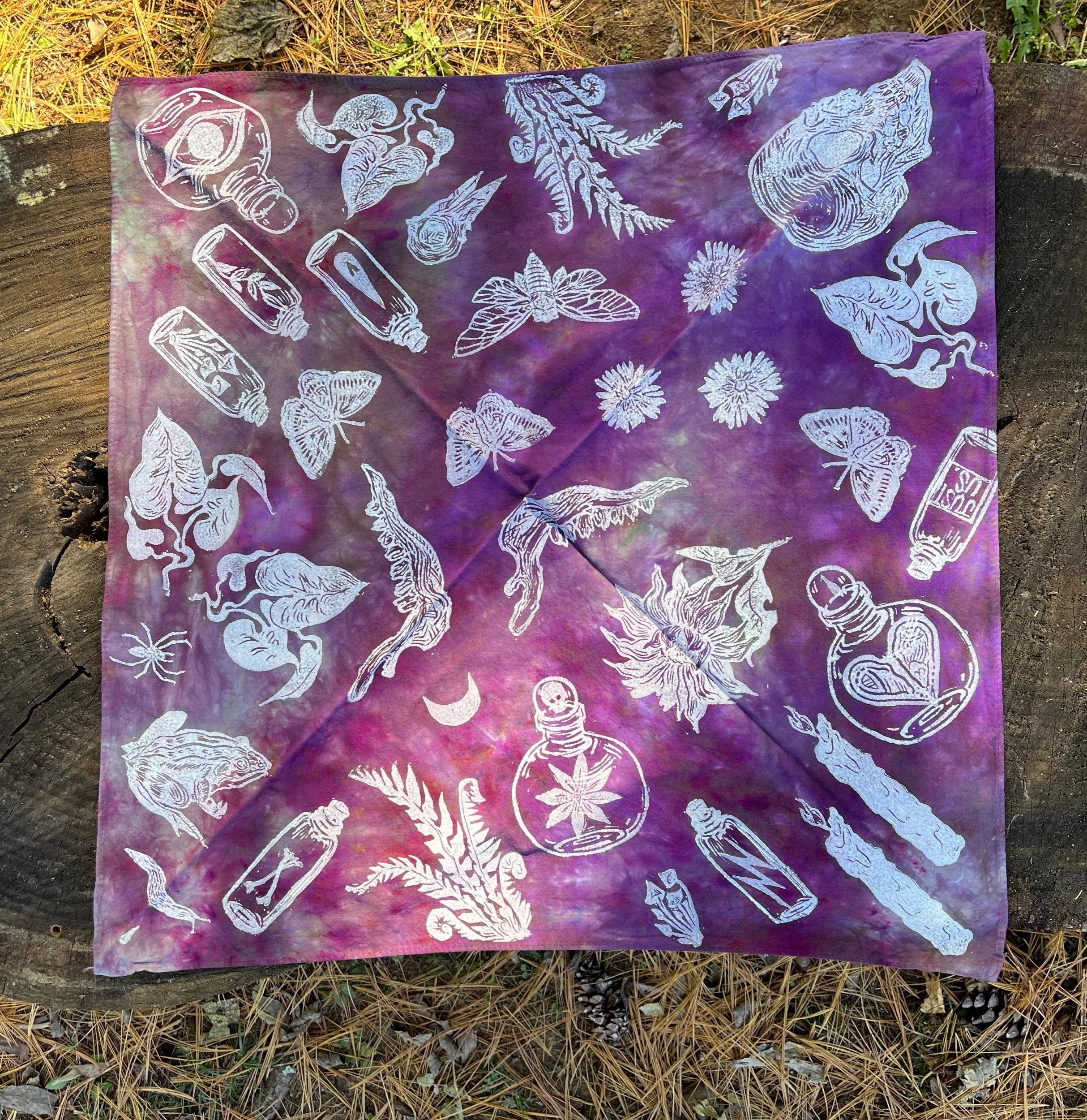 Hand stamped and ice-dyed cotton bandana, 20 x 20 inches.