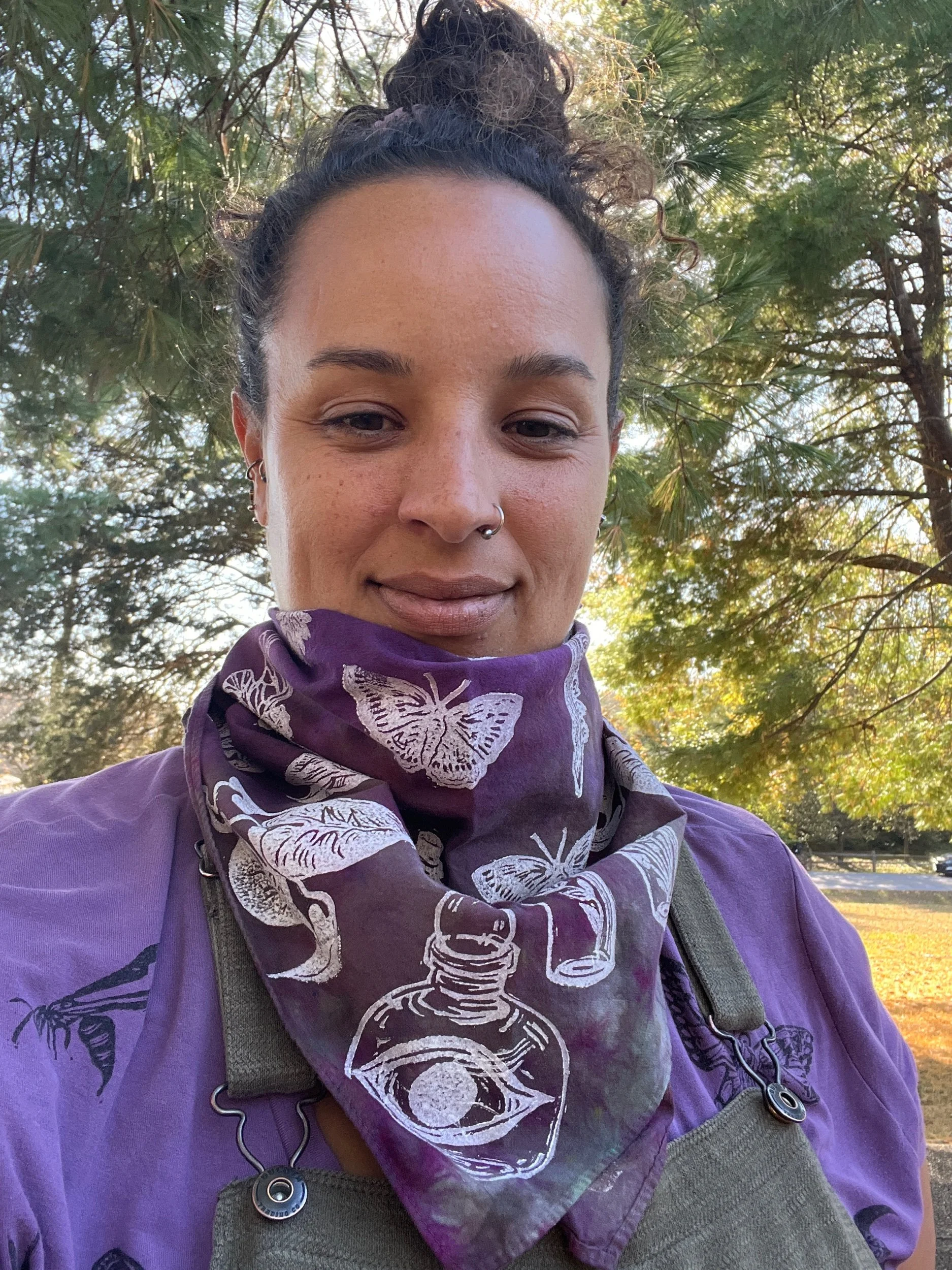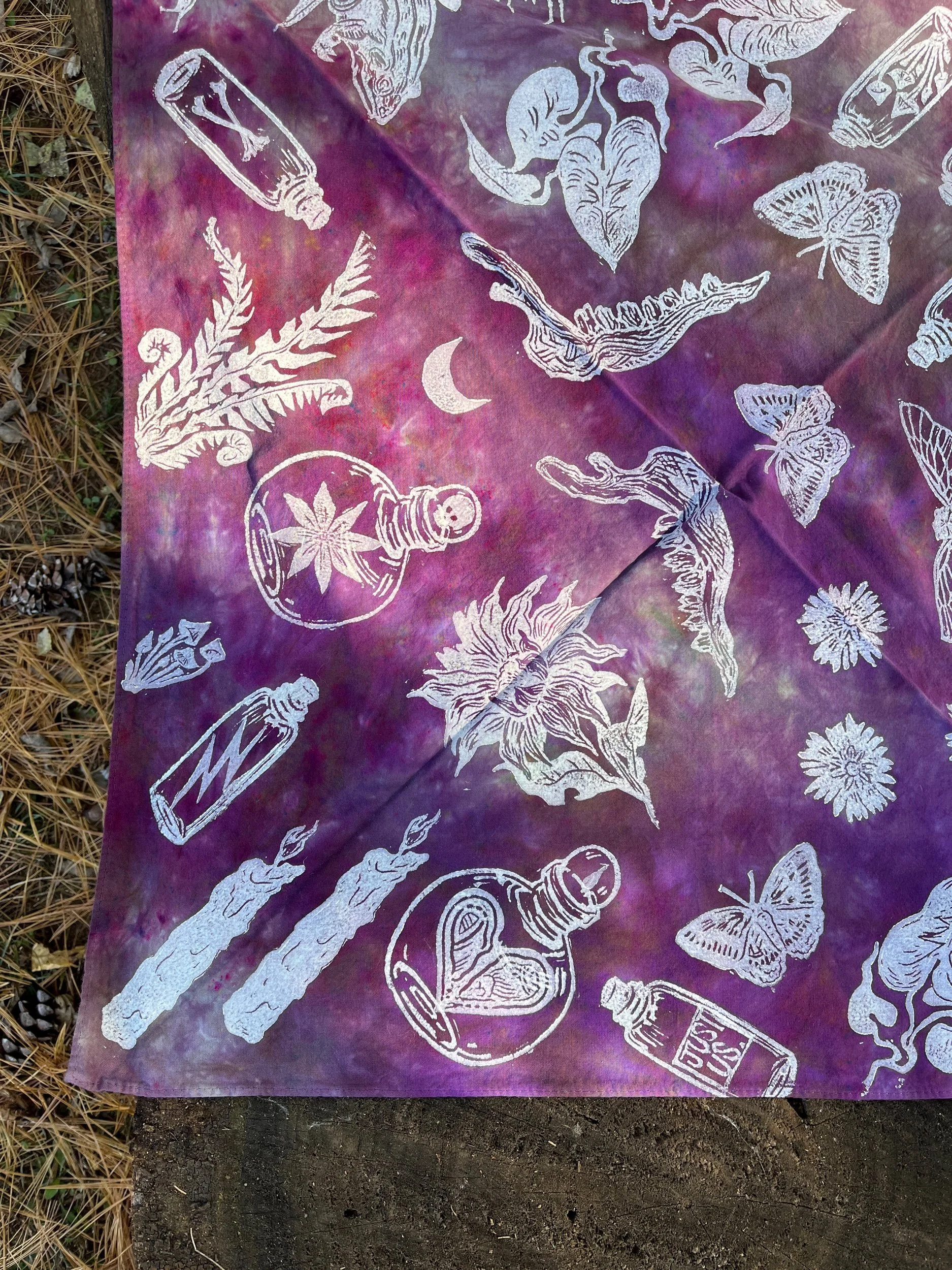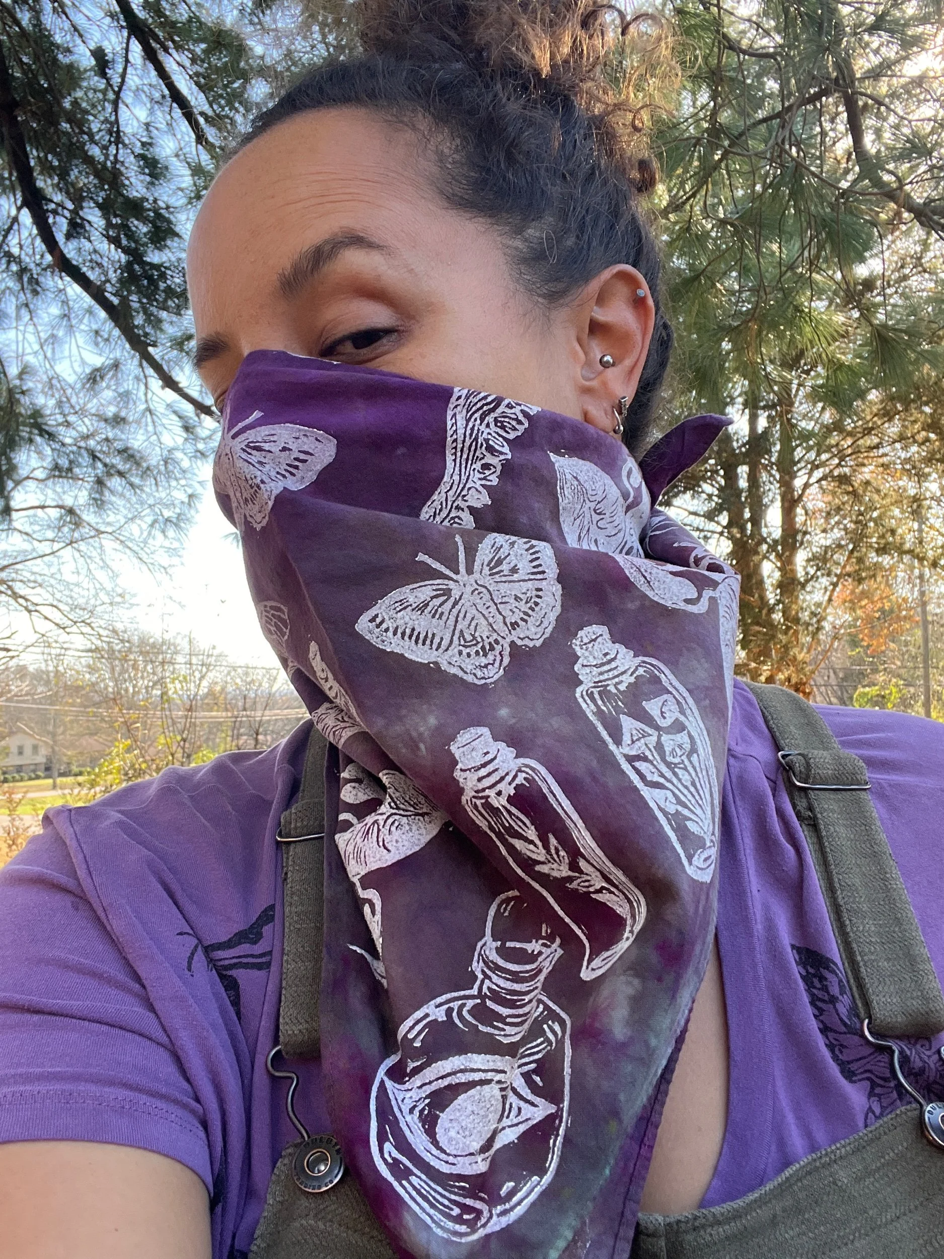 Hand stamped and ice-dyed cotton bandana, 20 x 20 inches.