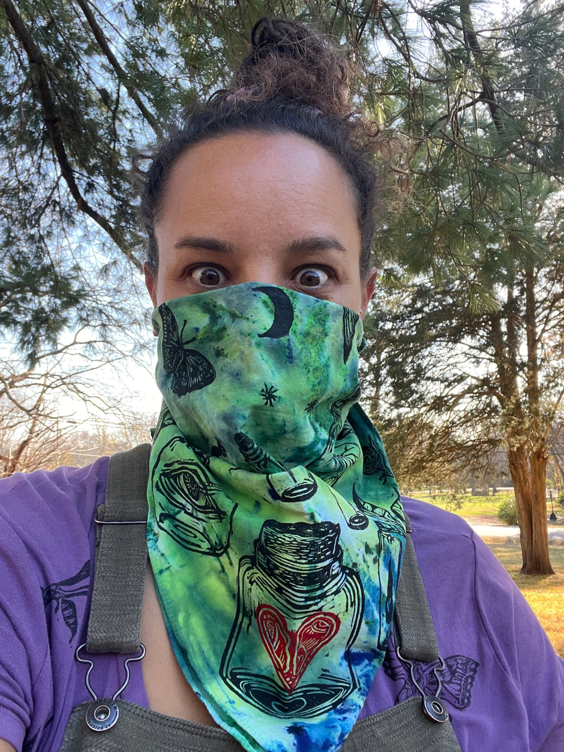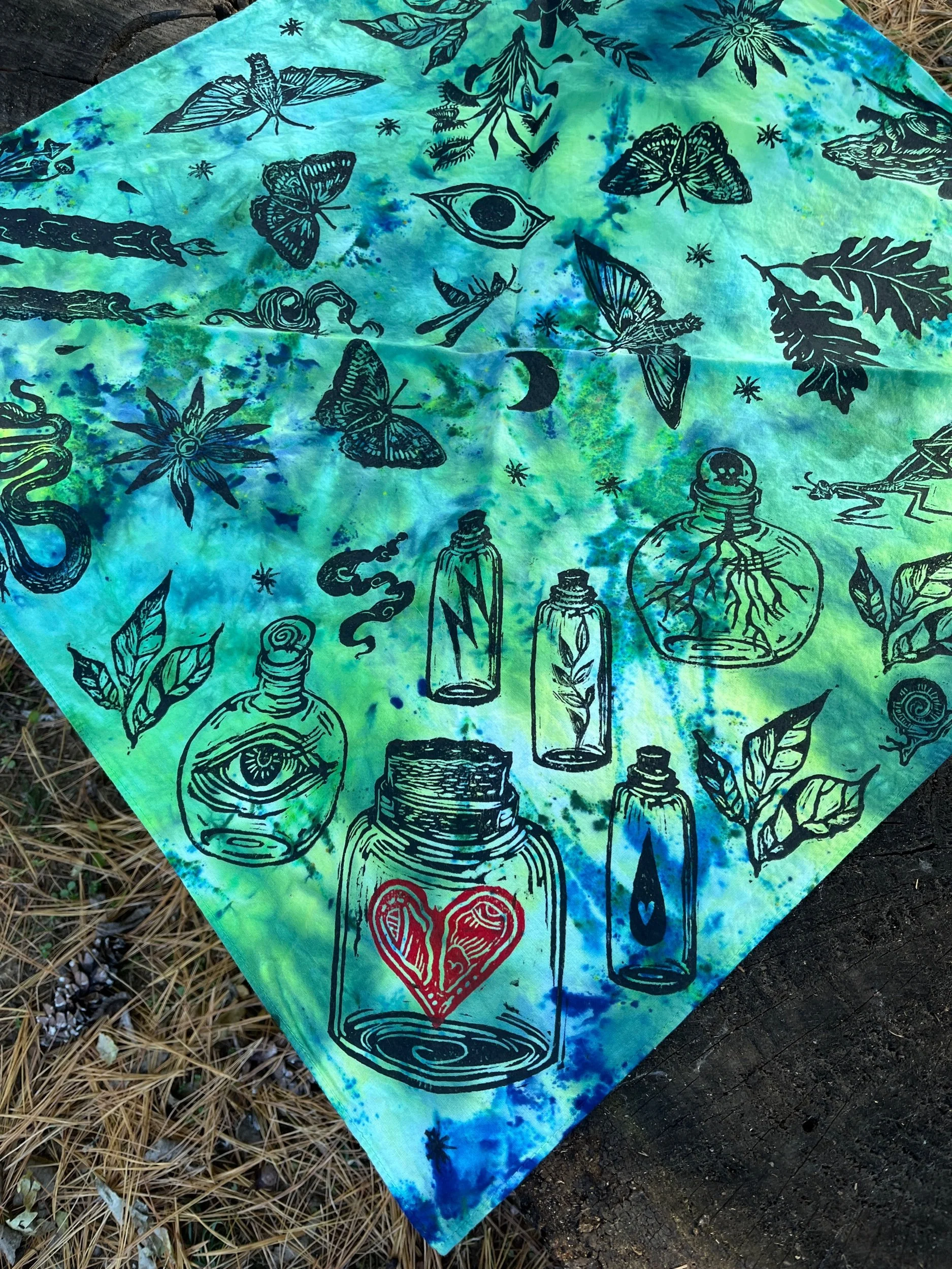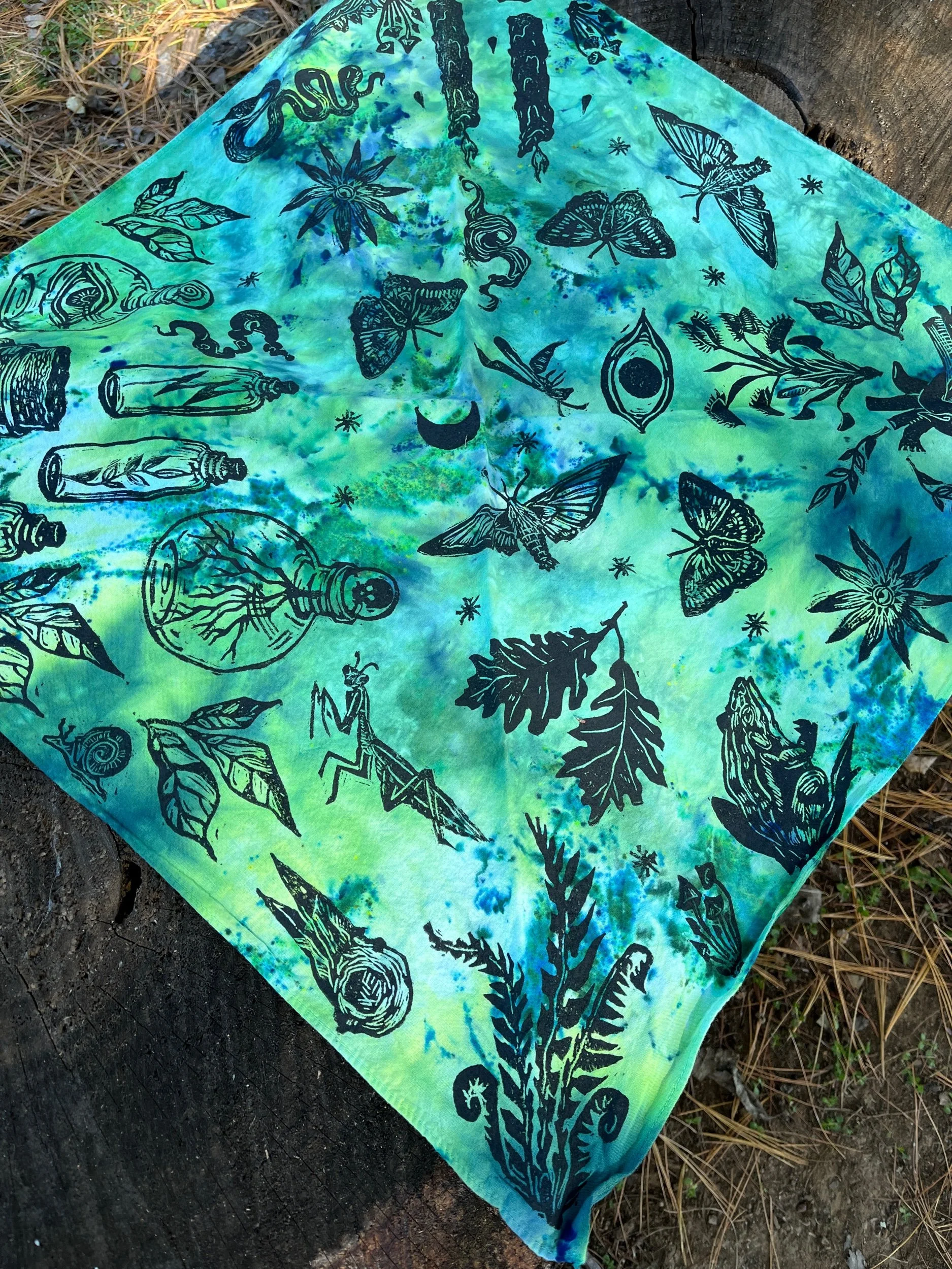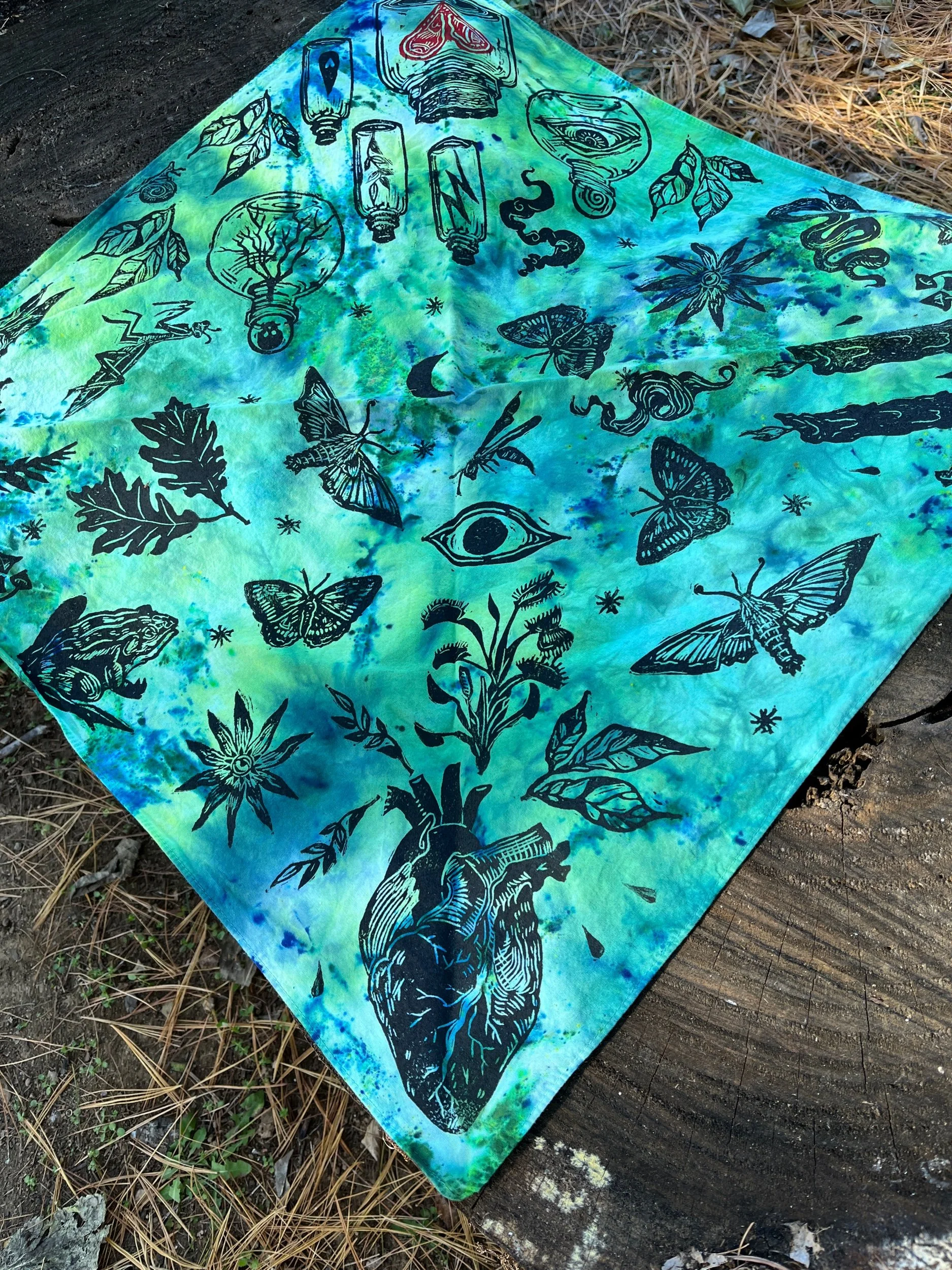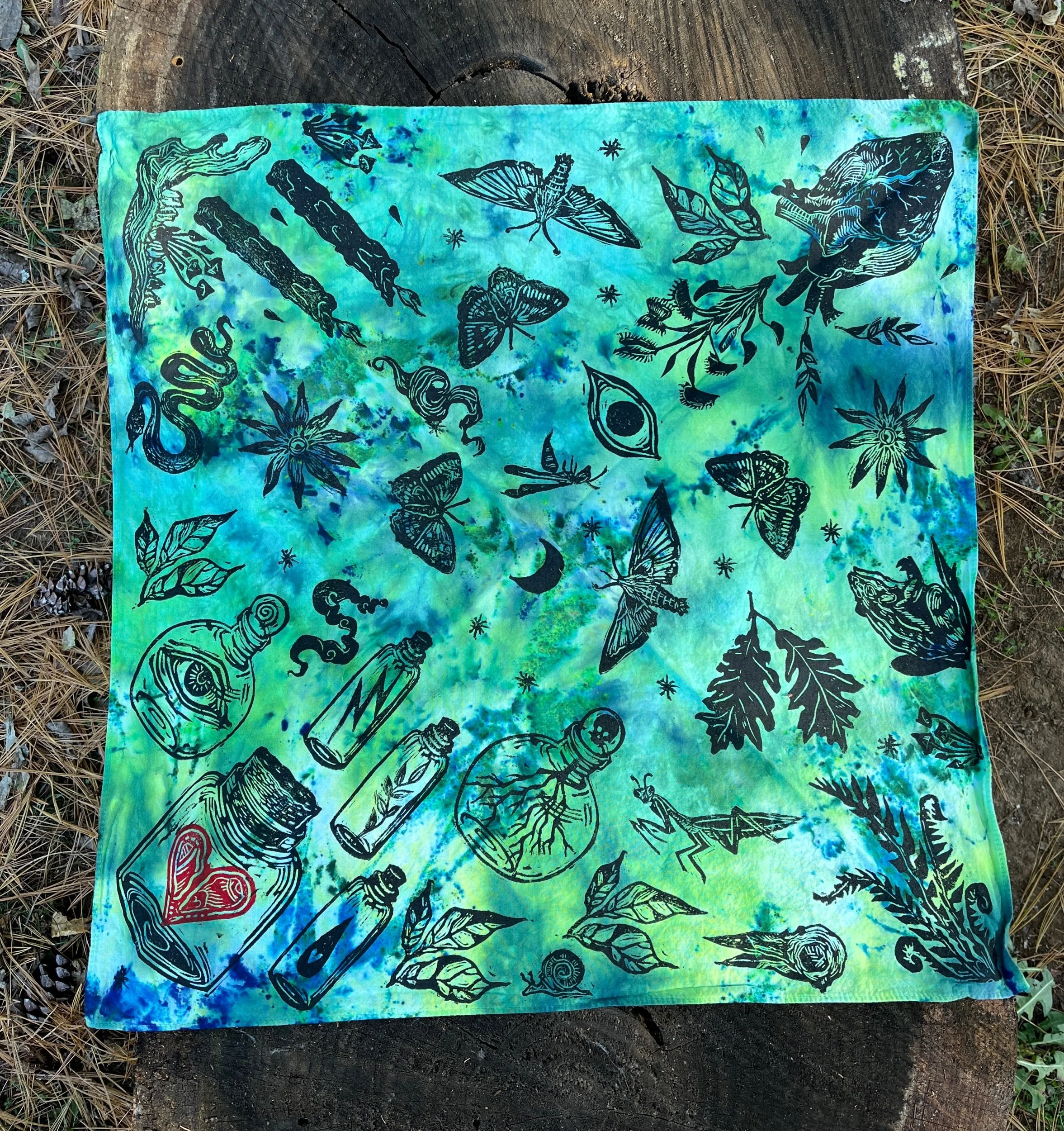 Hand stamped and ice-dyed cotton bandana, 20 x 20 inches.