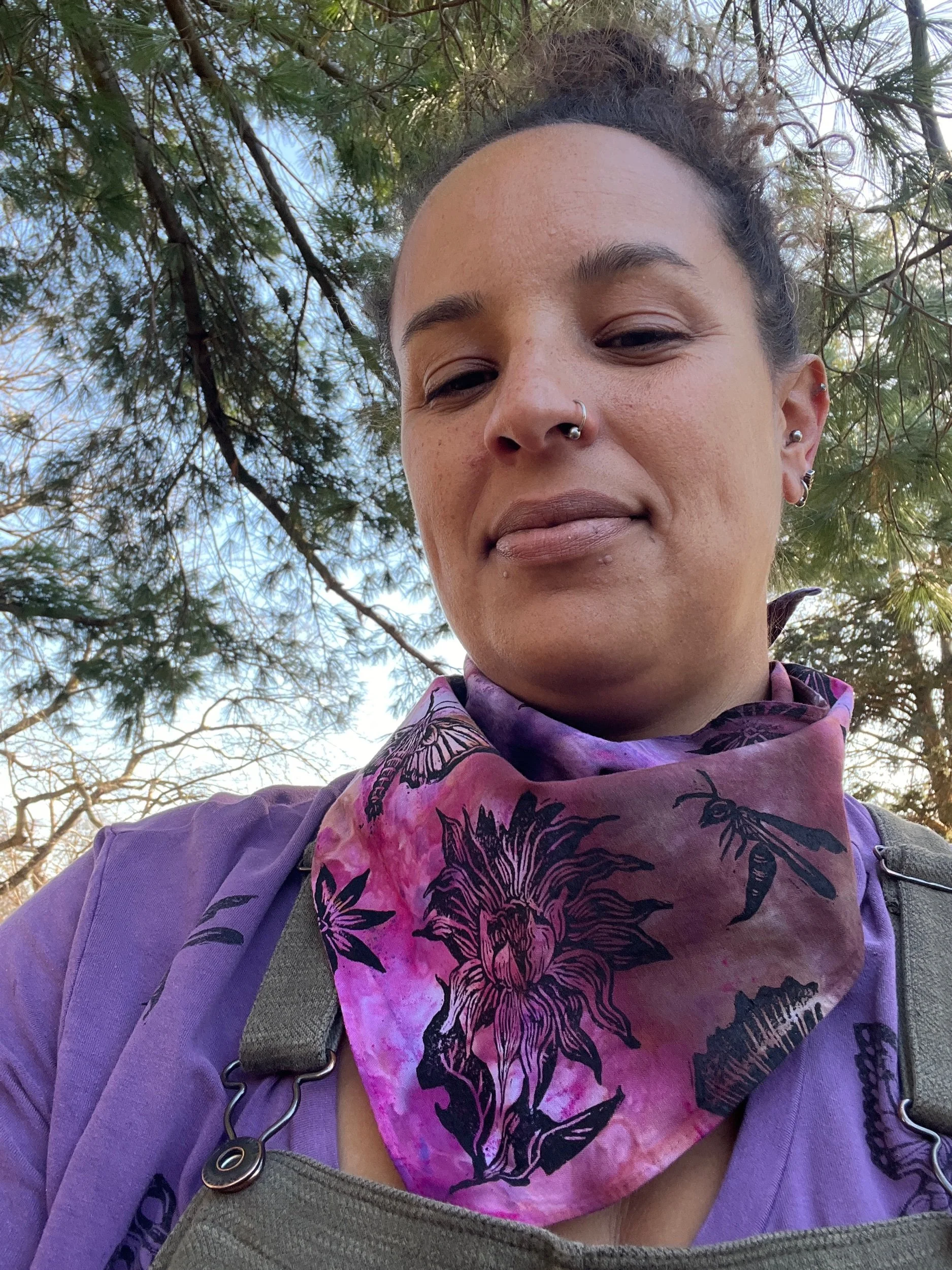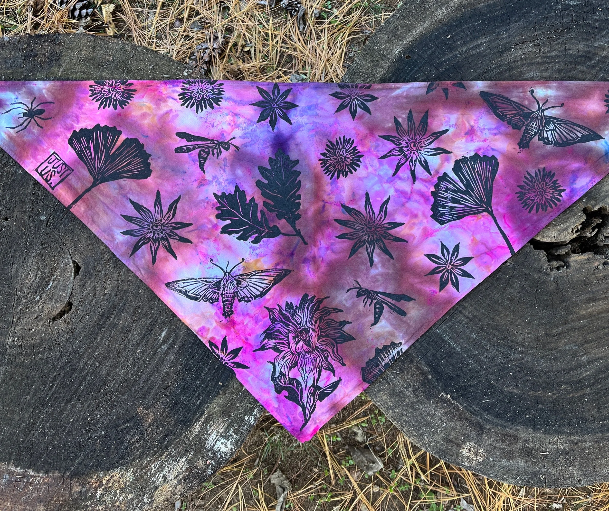 Hand stamped and ice-dyed cotton bandana, 29 x 14 x 20 inches.
