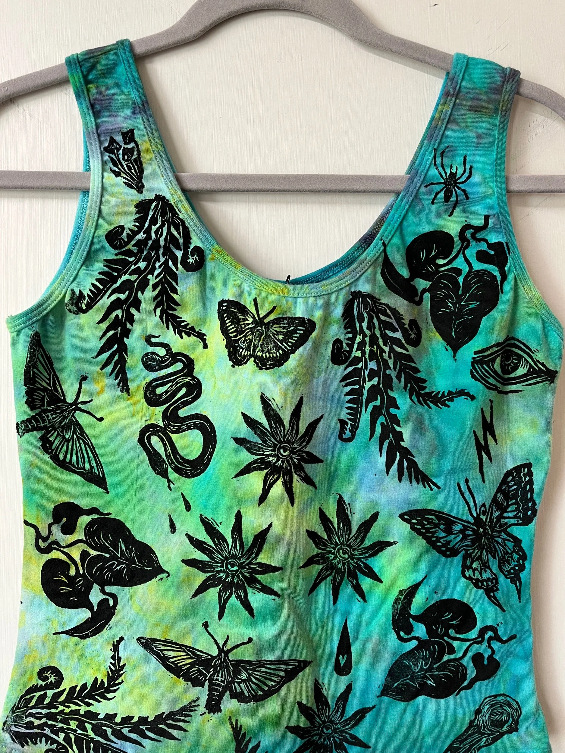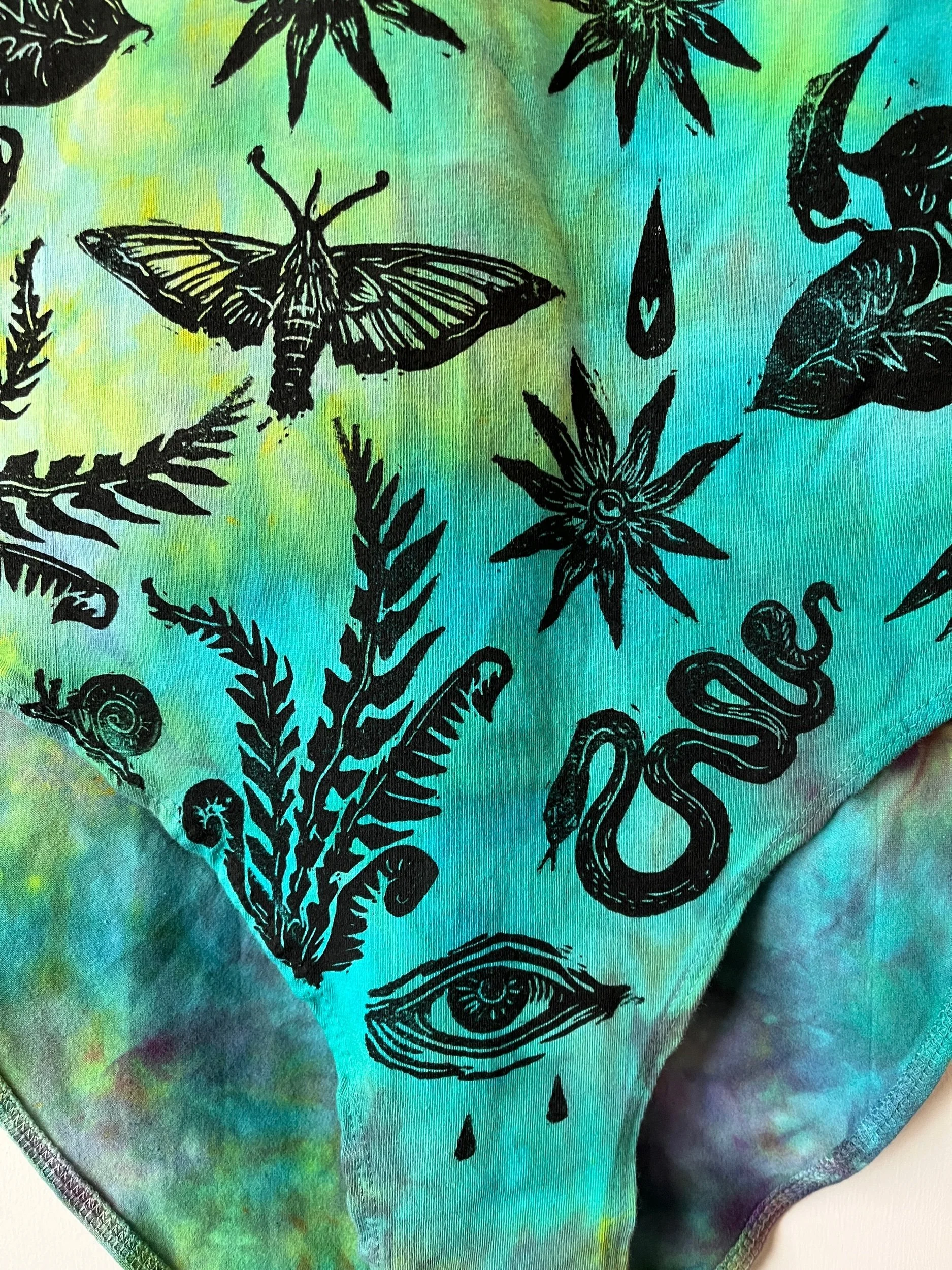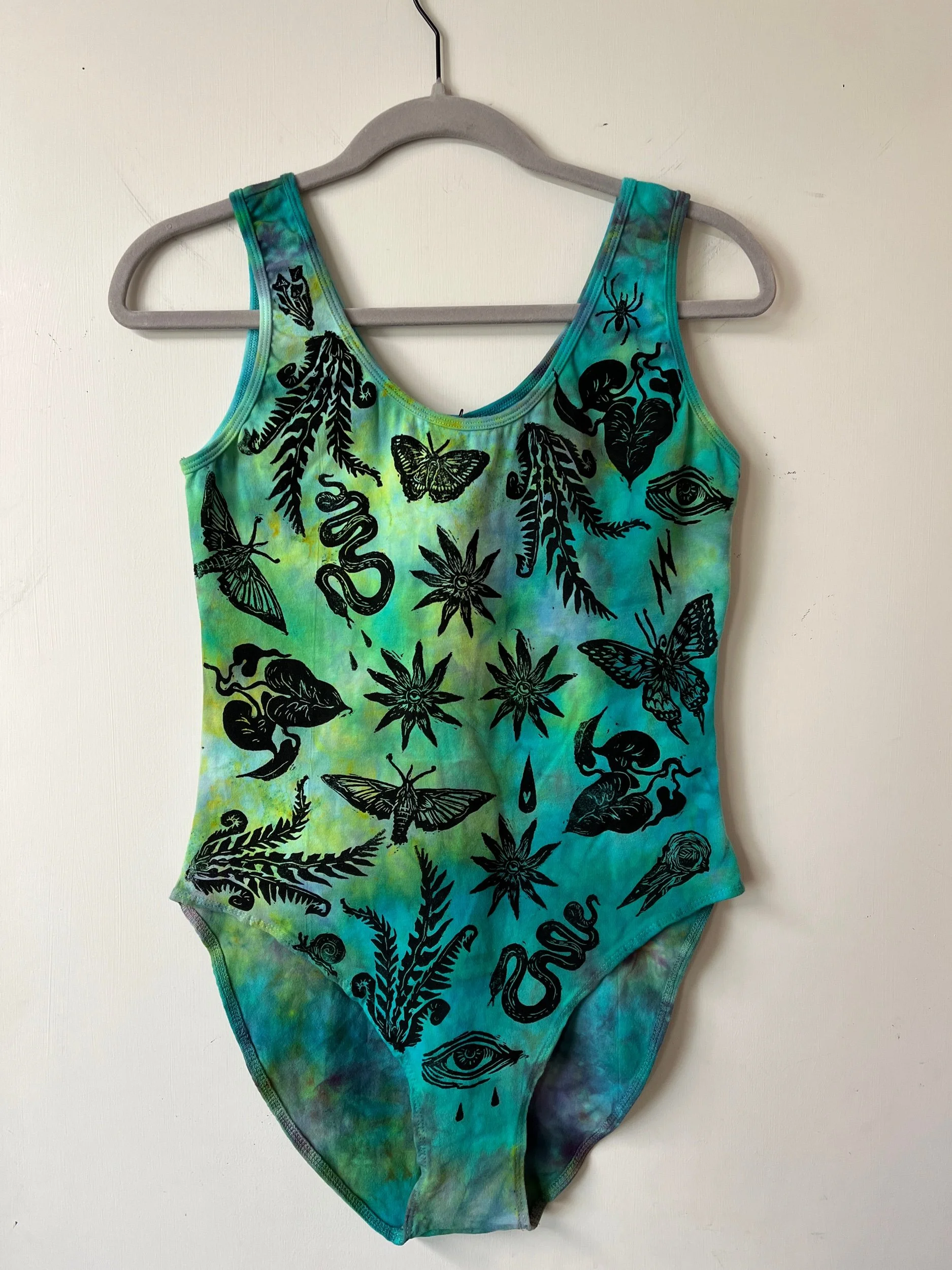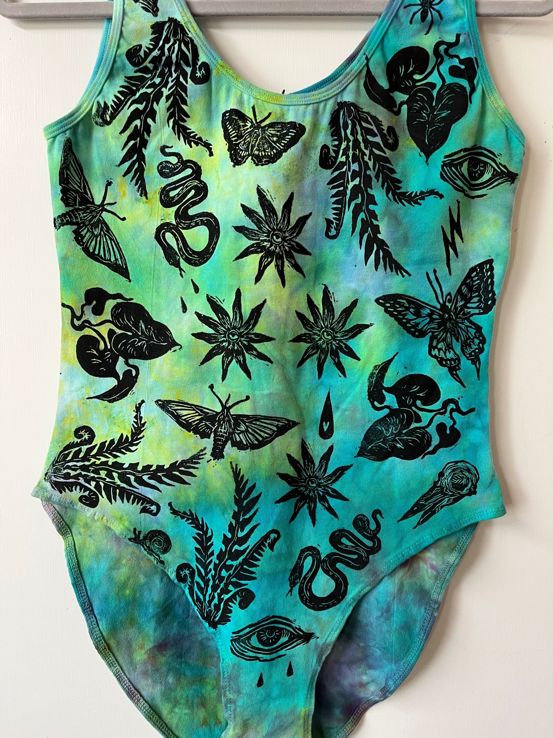 Hand stamped and ice-dyed 92% cotton 8% spandex leotard, size XLarge- these are nice and stretchy!