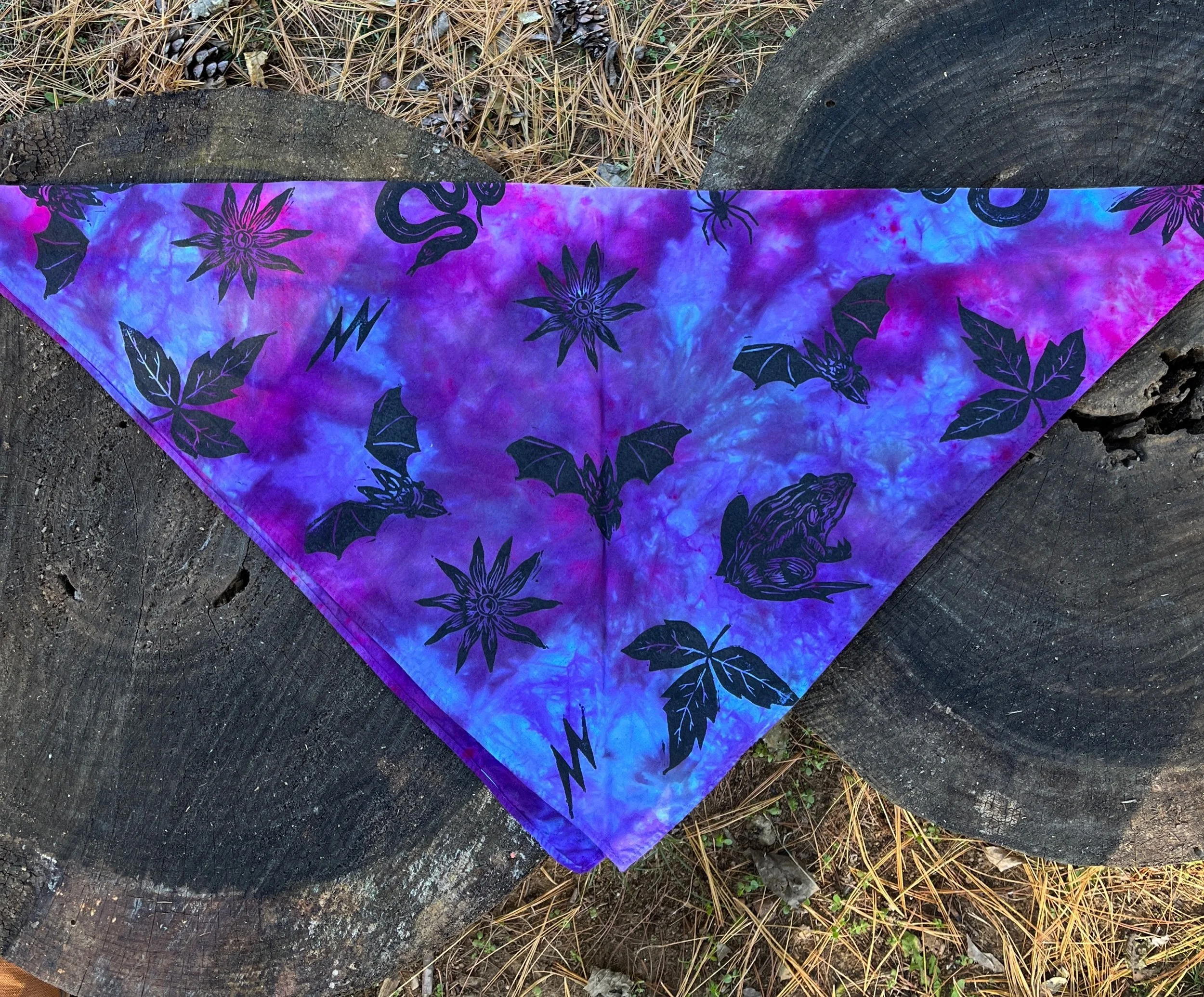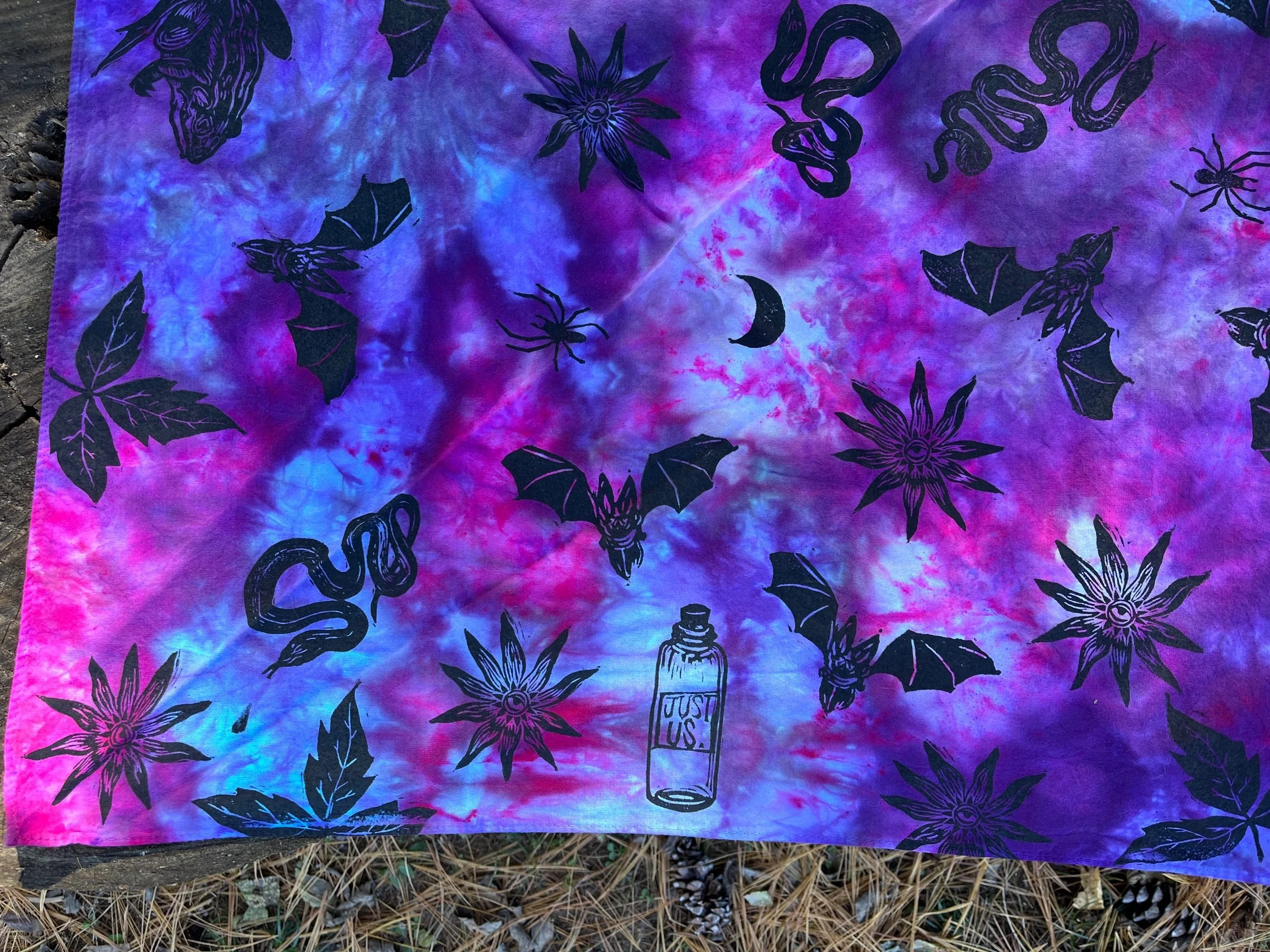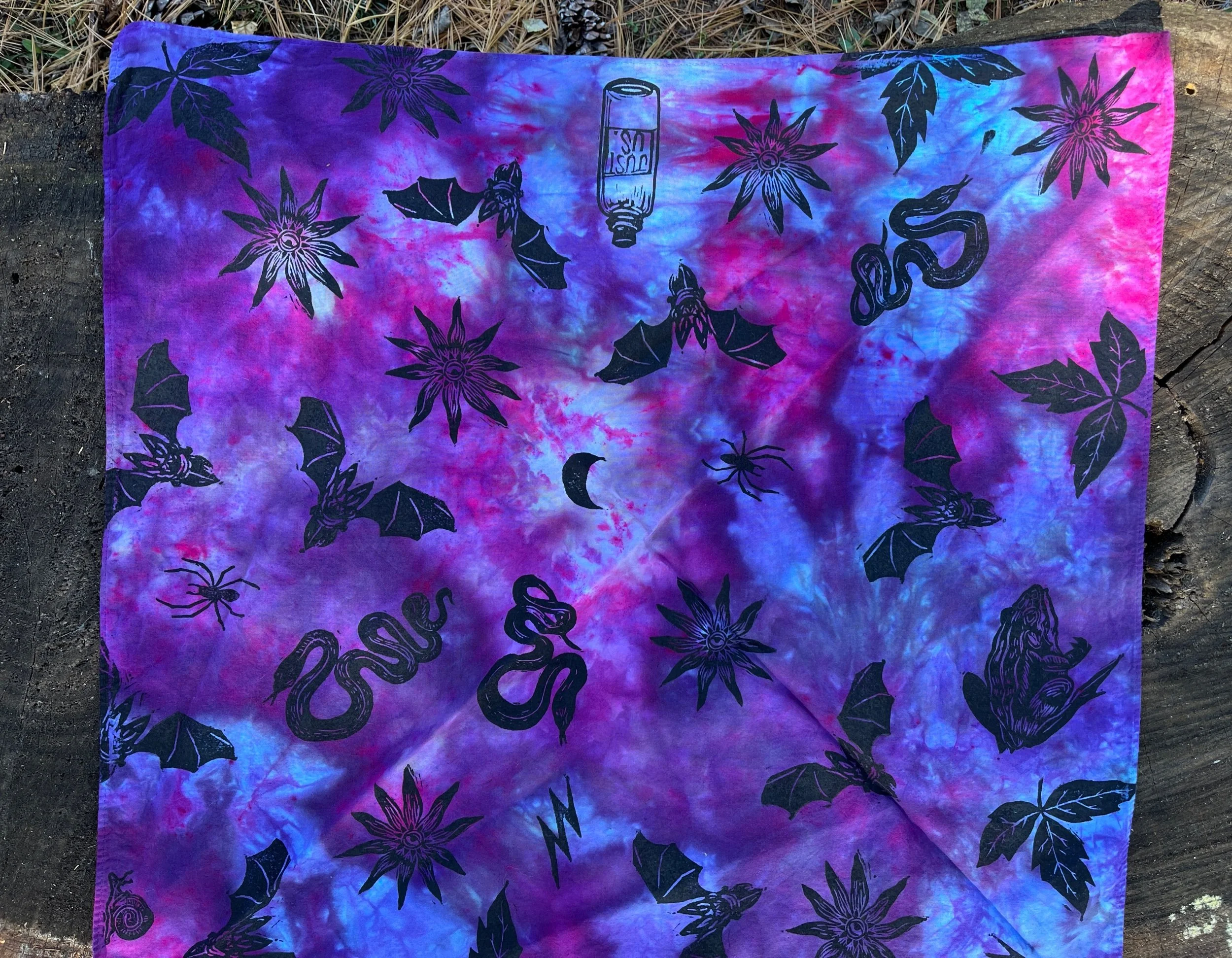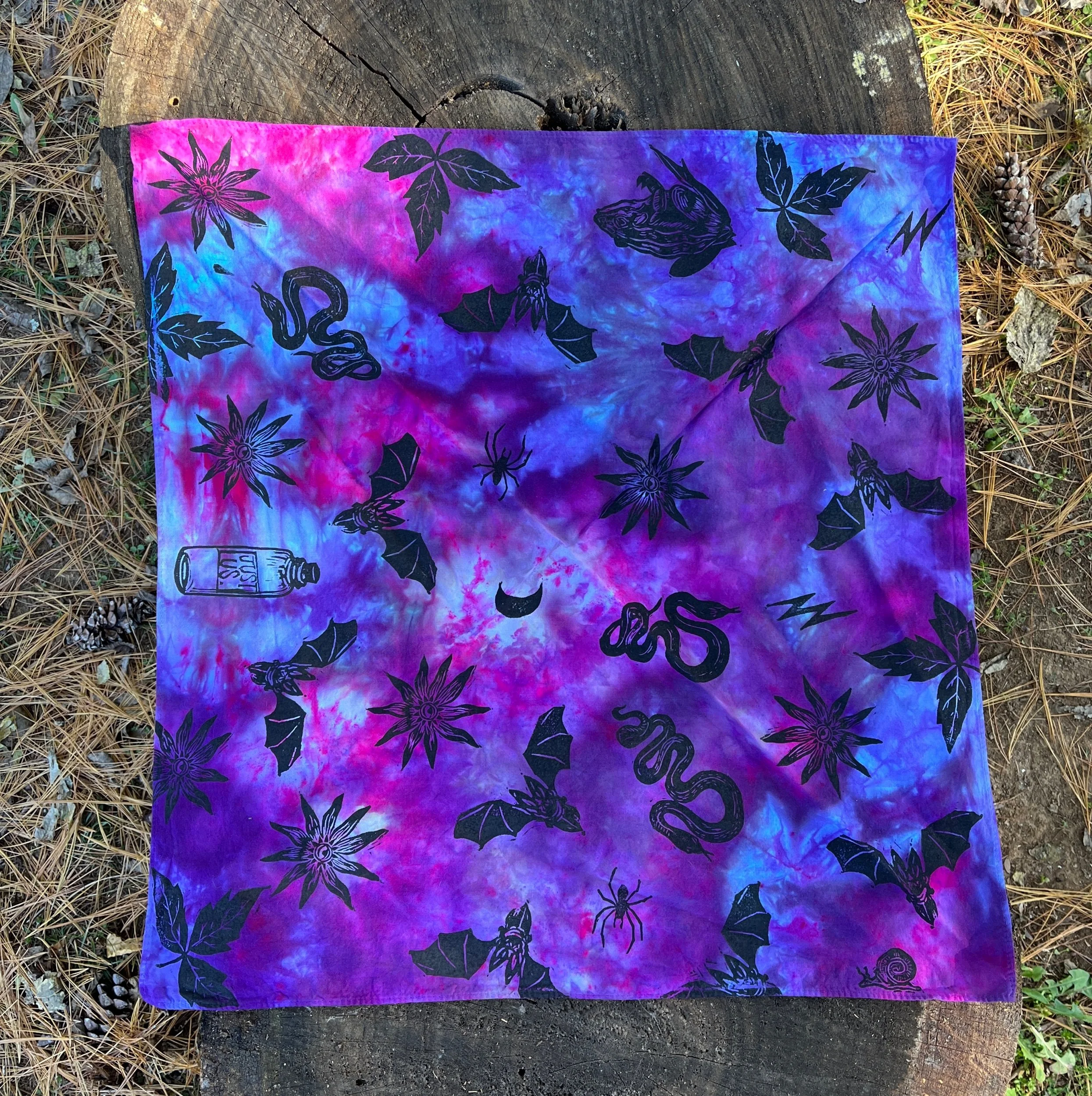 Hand stamped and ice-dyed cotton bandana, 20 x 20 inches.