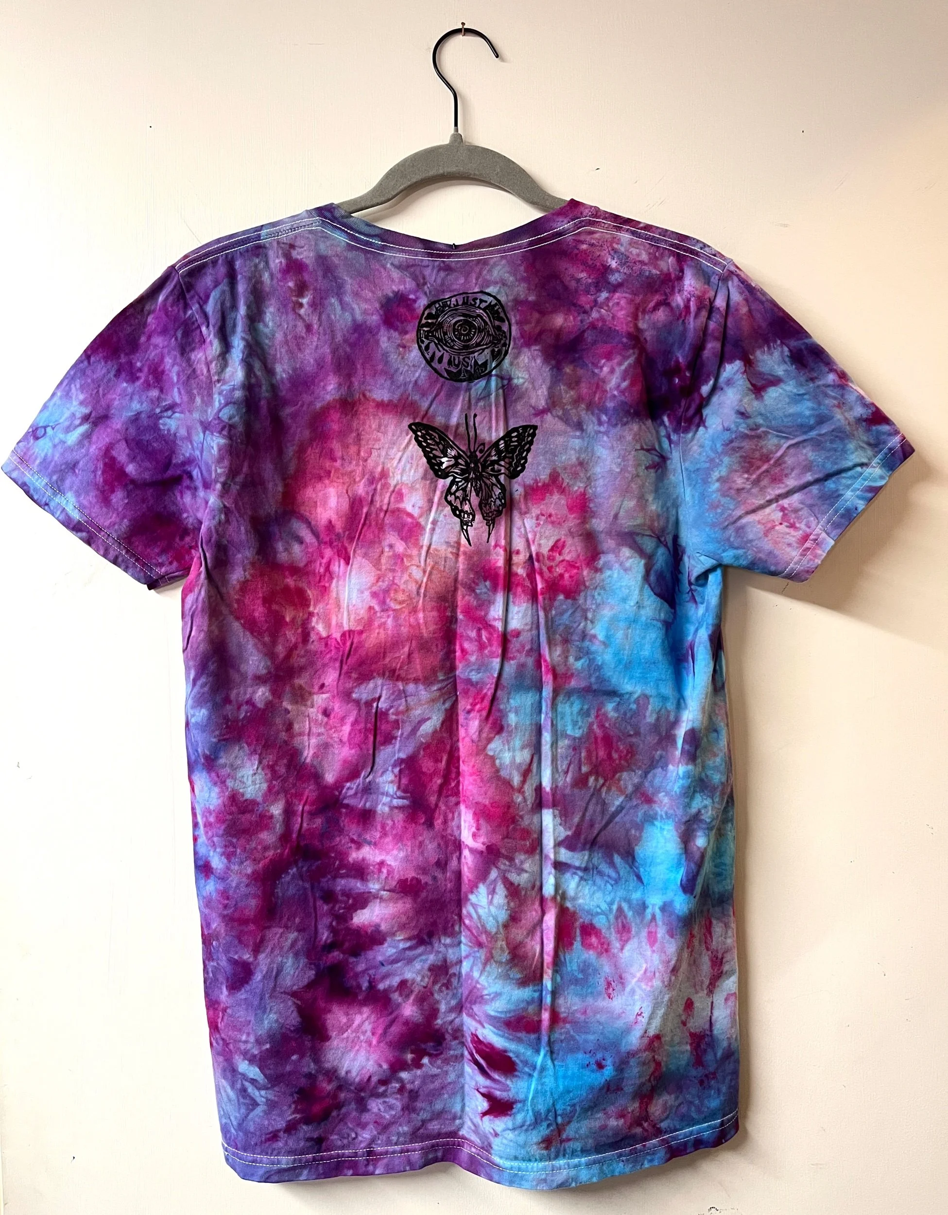 Hand stamped and ice-dyed cotton v-neck tee, size Small.