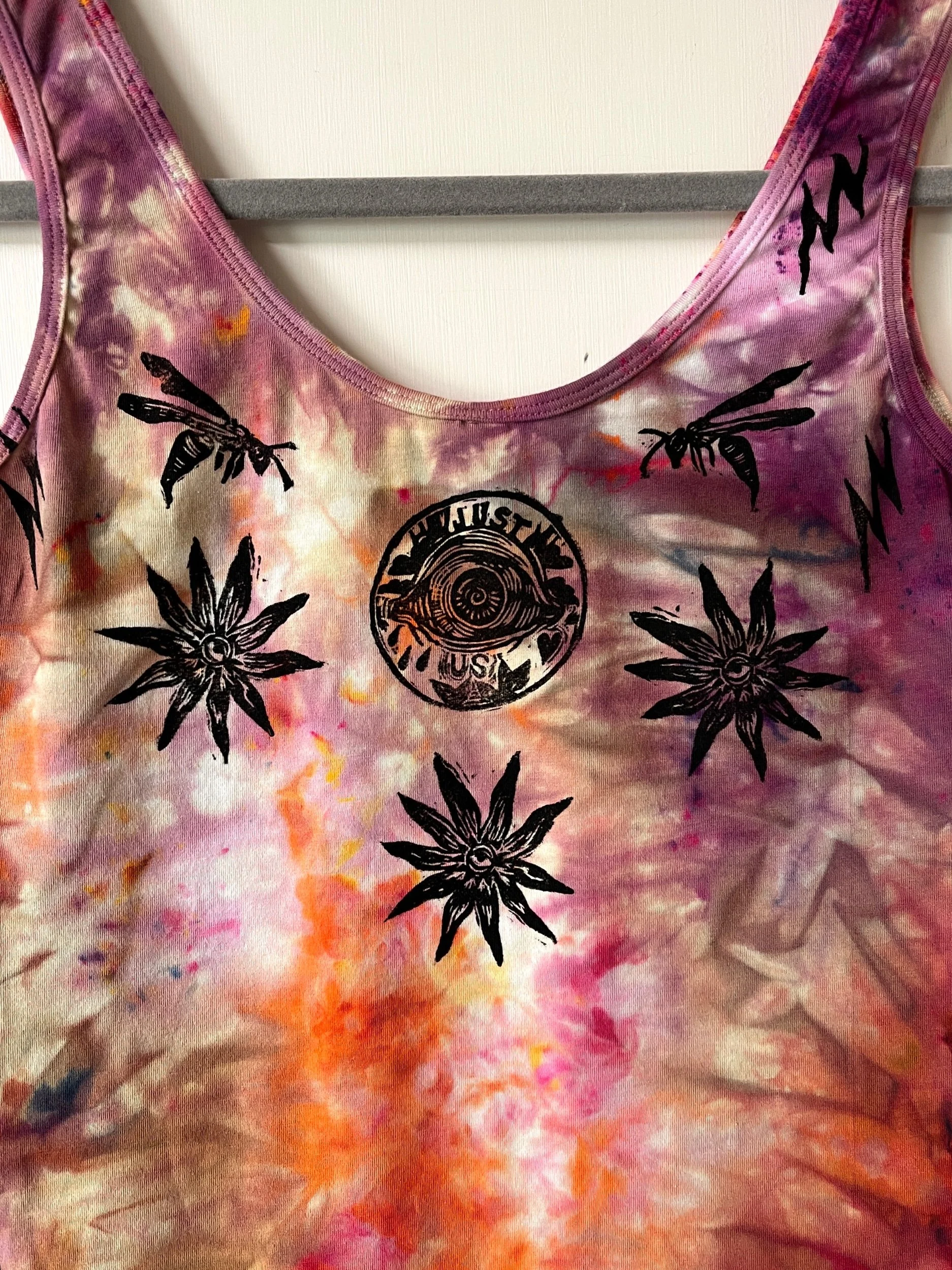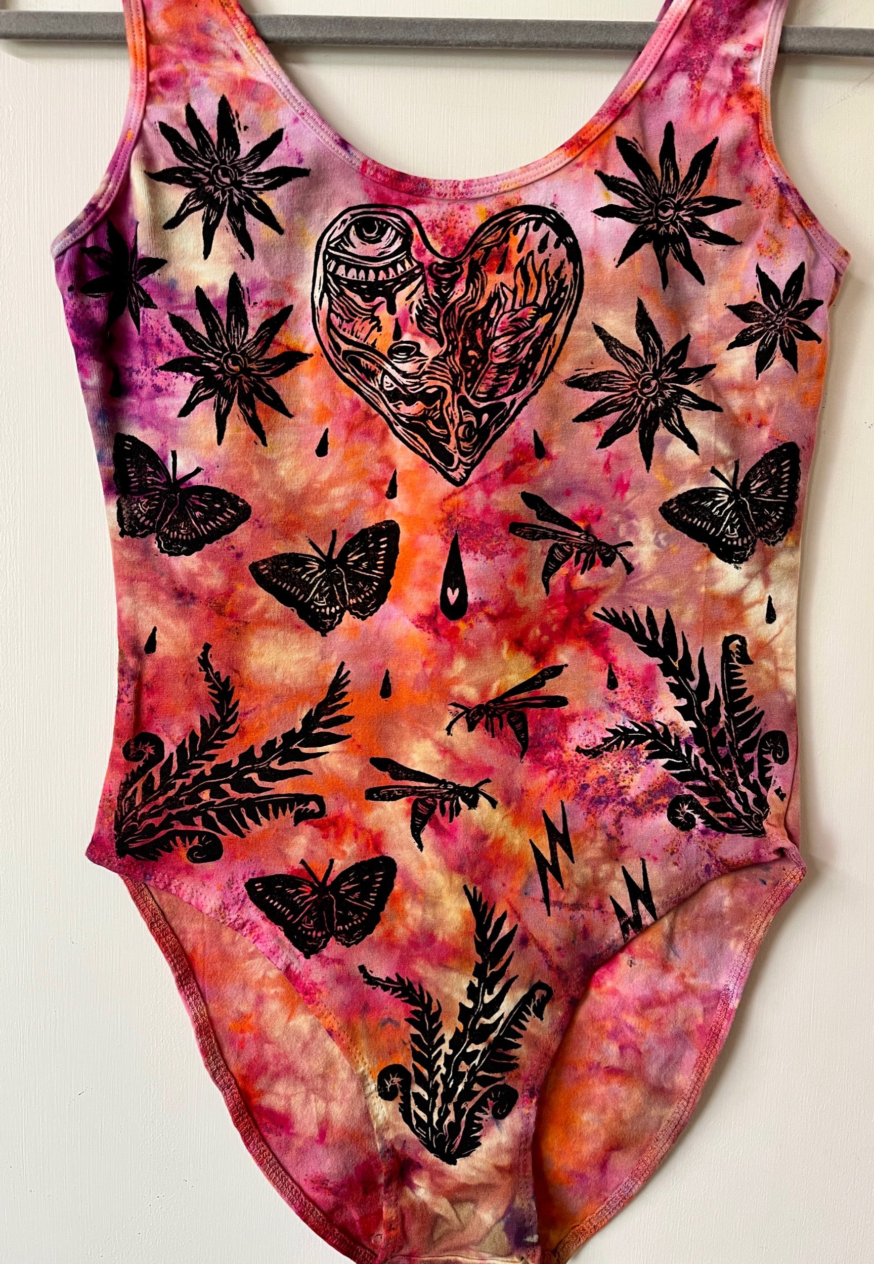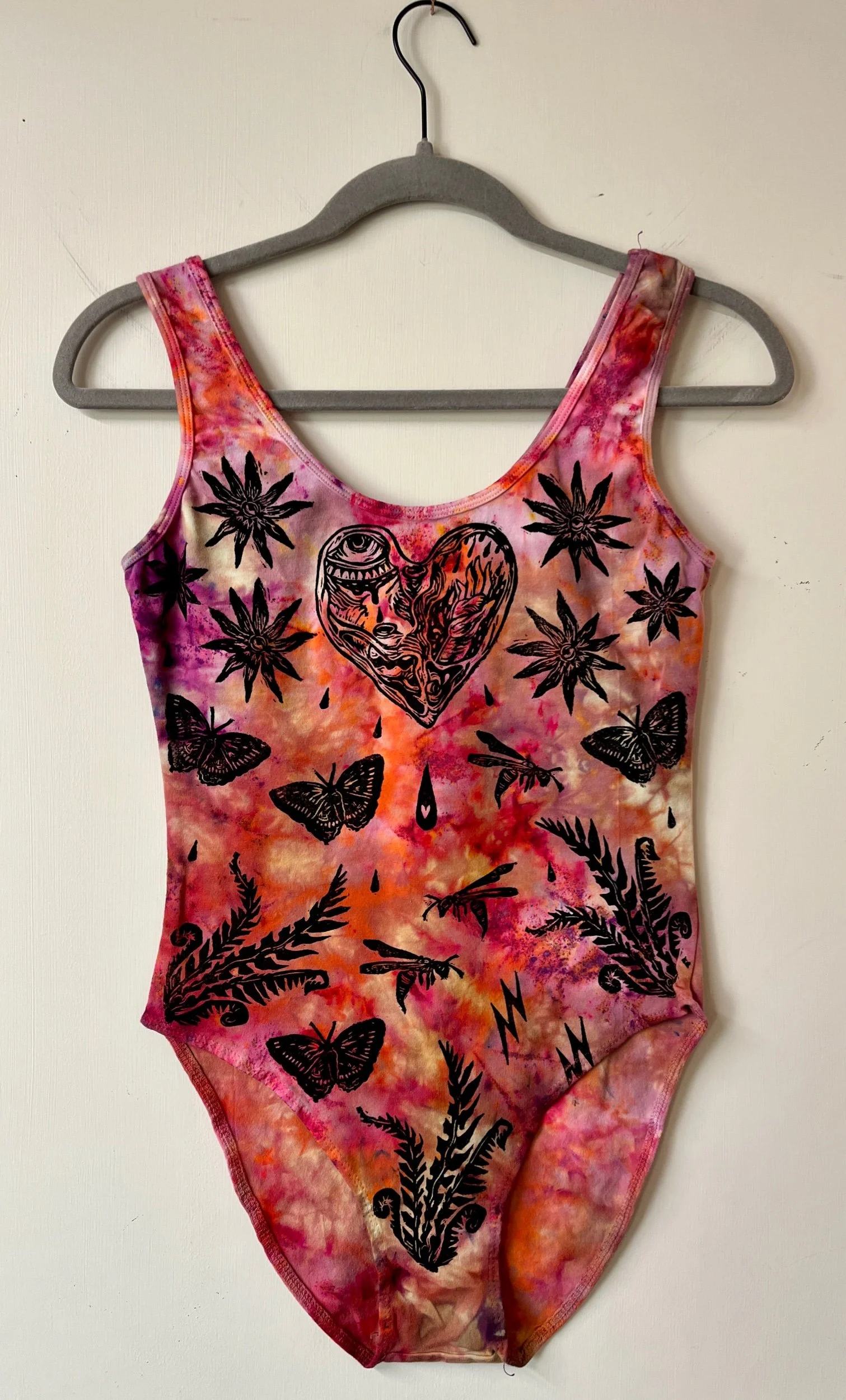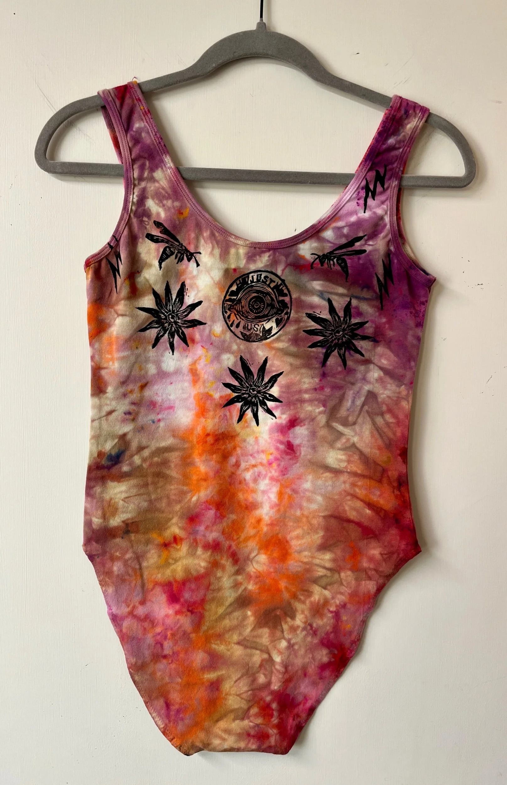 Hand stamped and ice-dyed 92% cotton 8% spandex leotard, size Large- these are nice and stretchy!