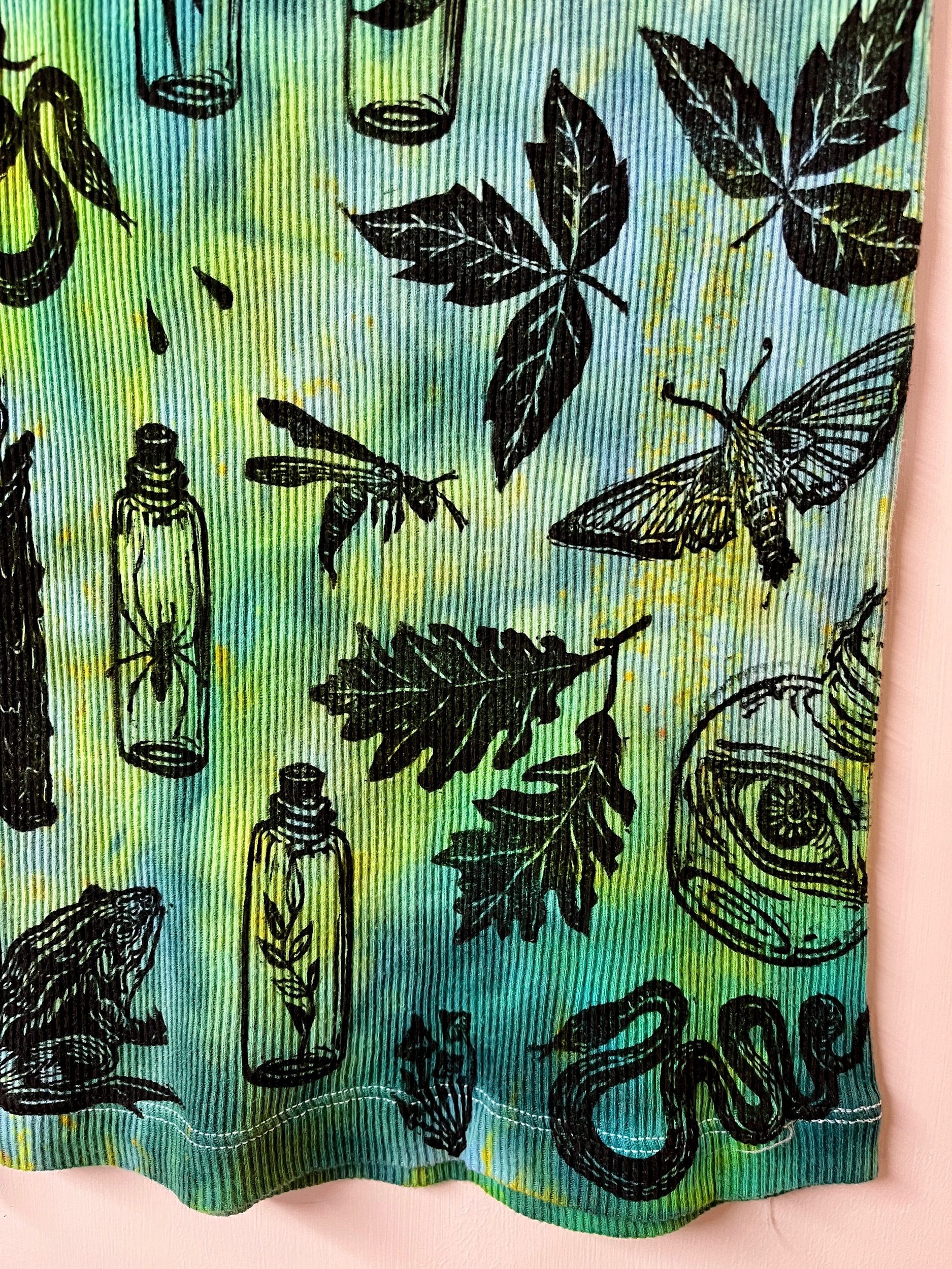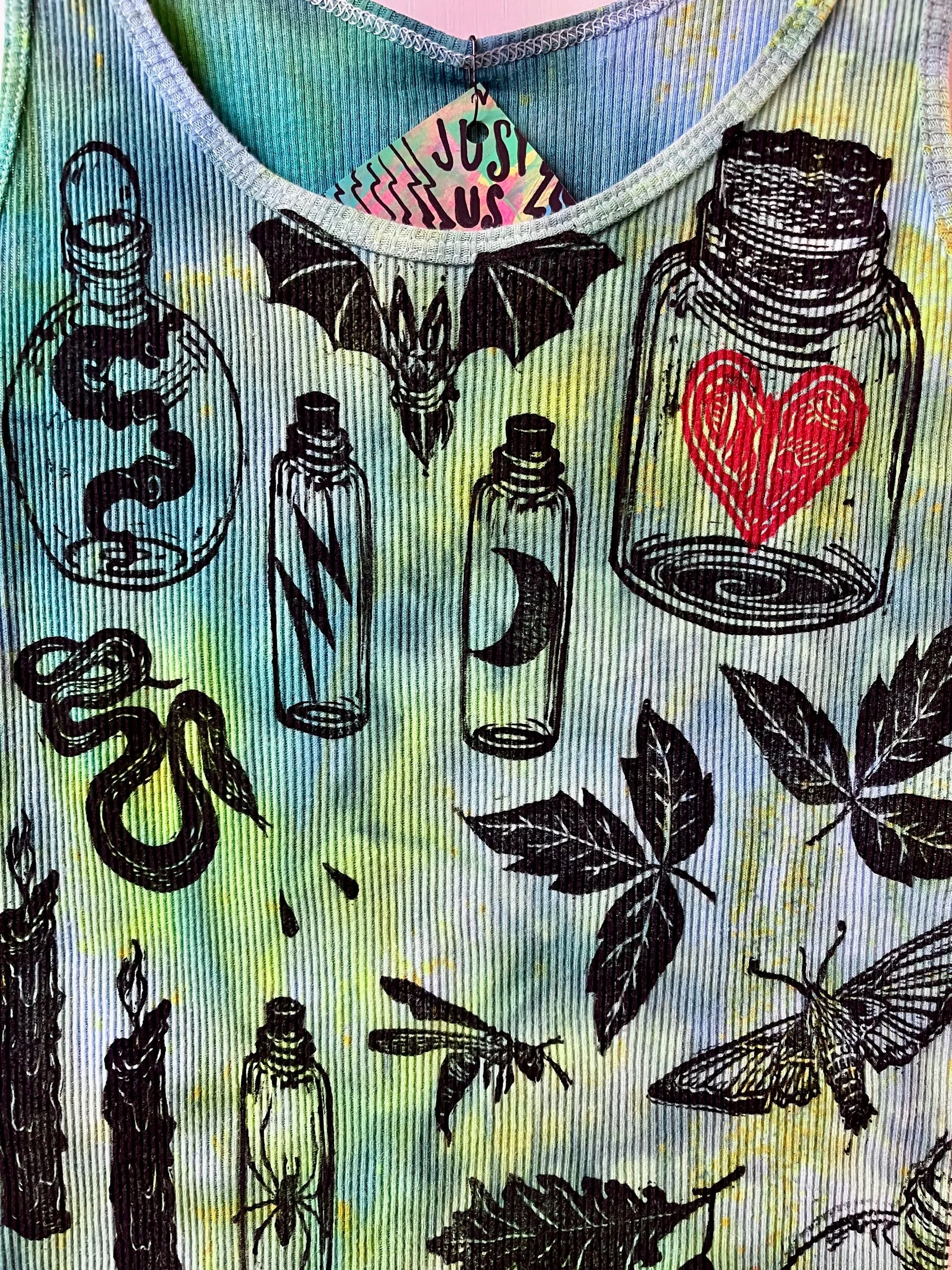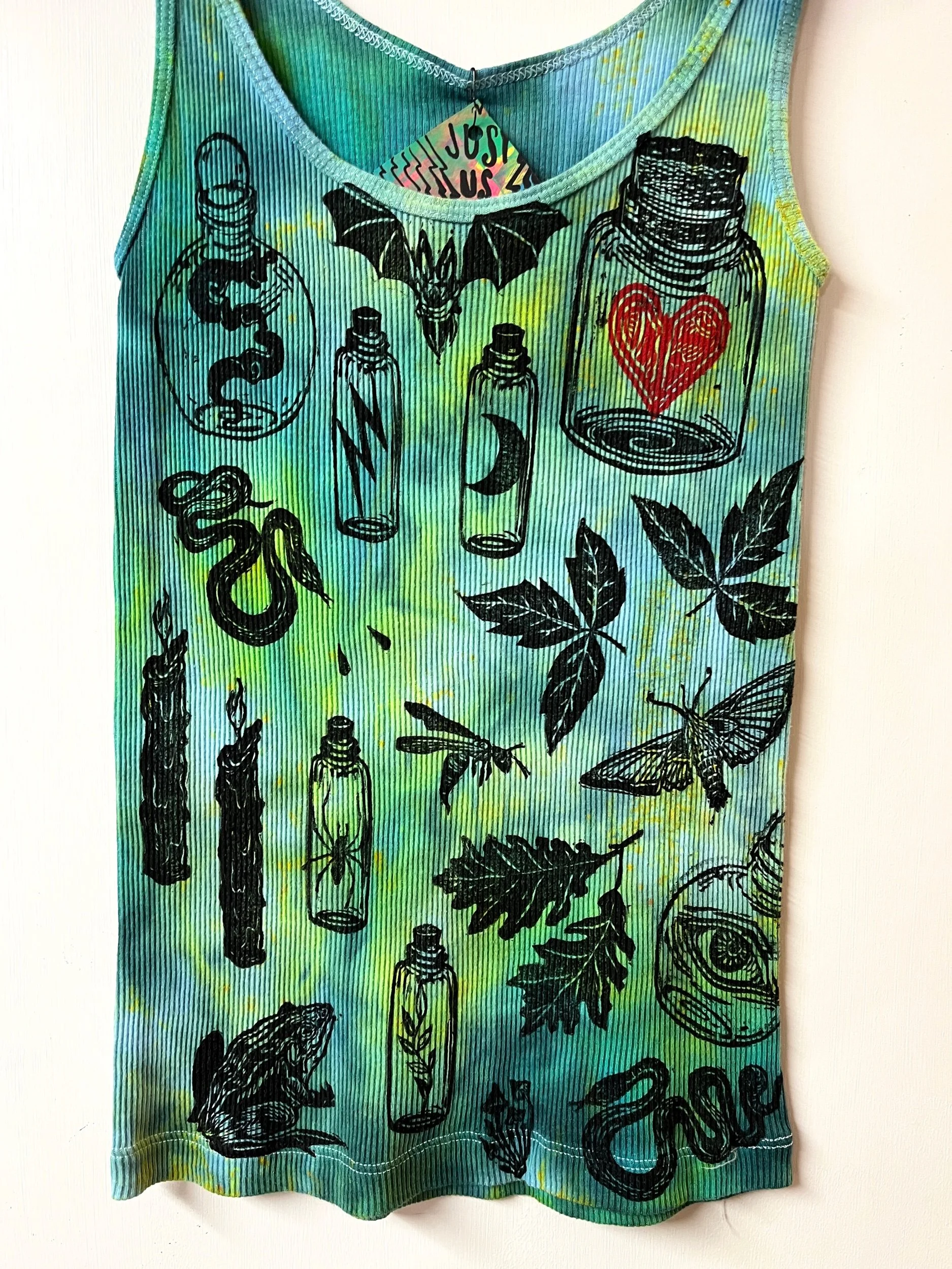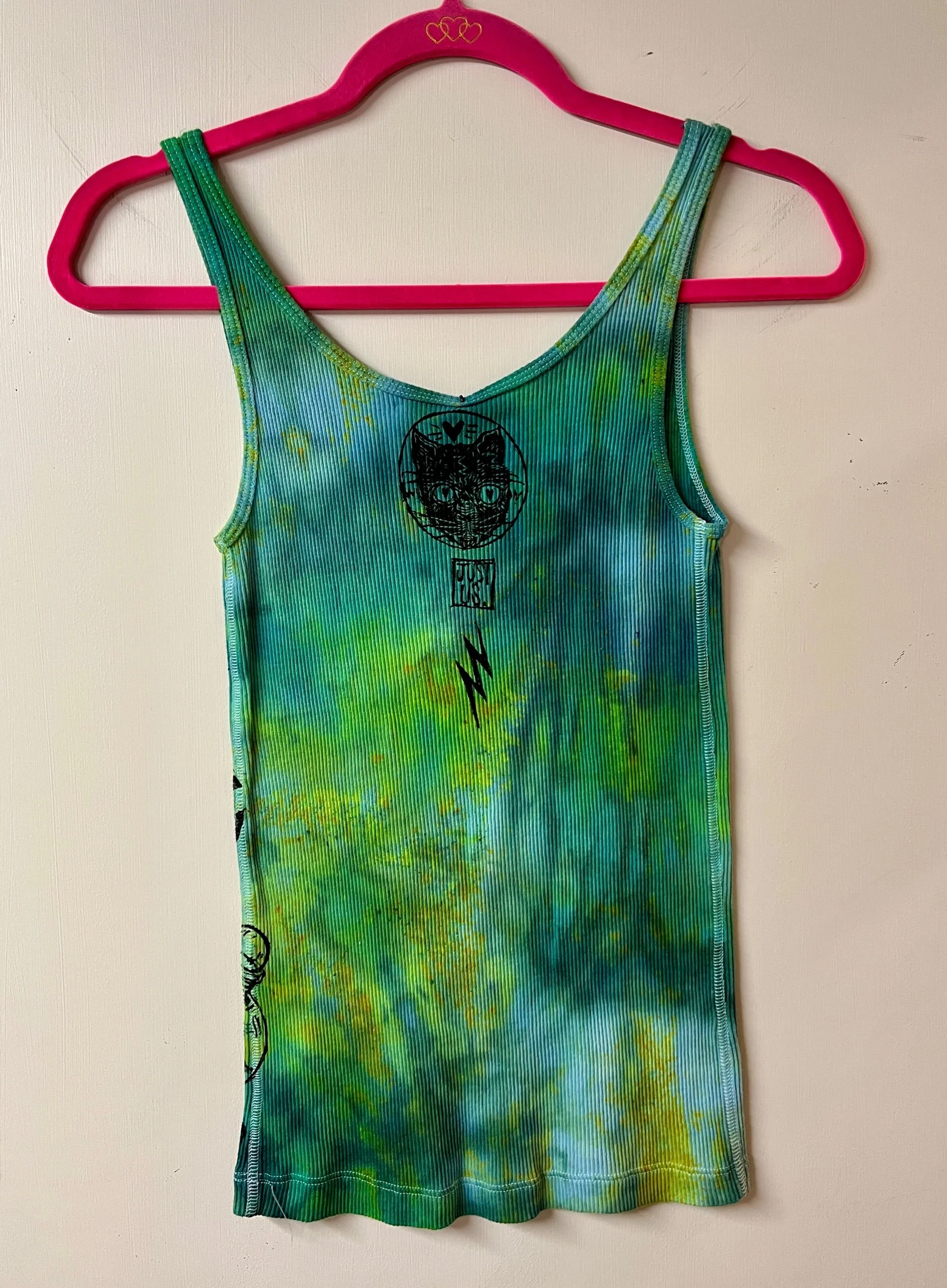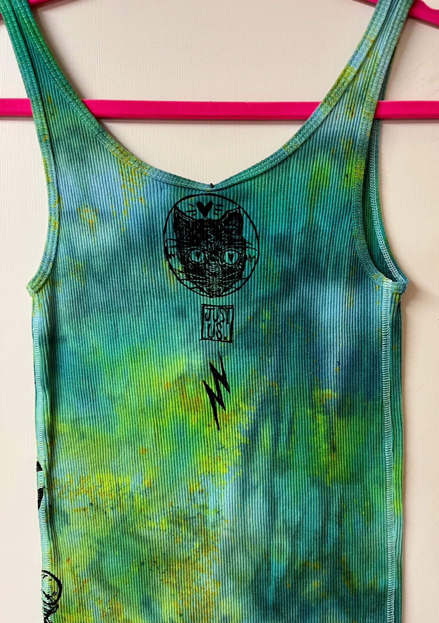 Hand stamped and ice-dyed ribbed cotton tank, size medium.