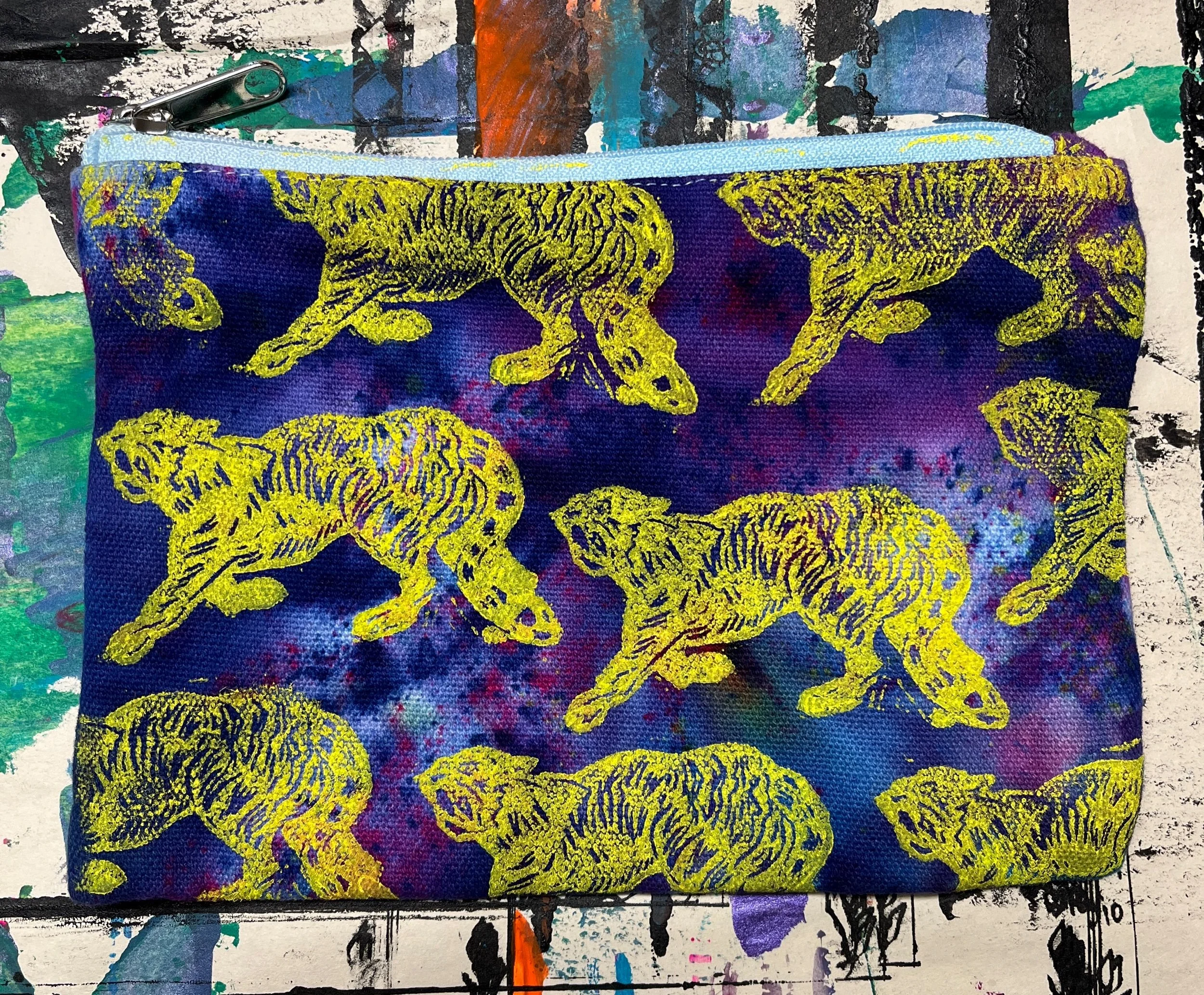 Hand stamped large cotton canvas zipper pouch, 5.5 x 8 inches.