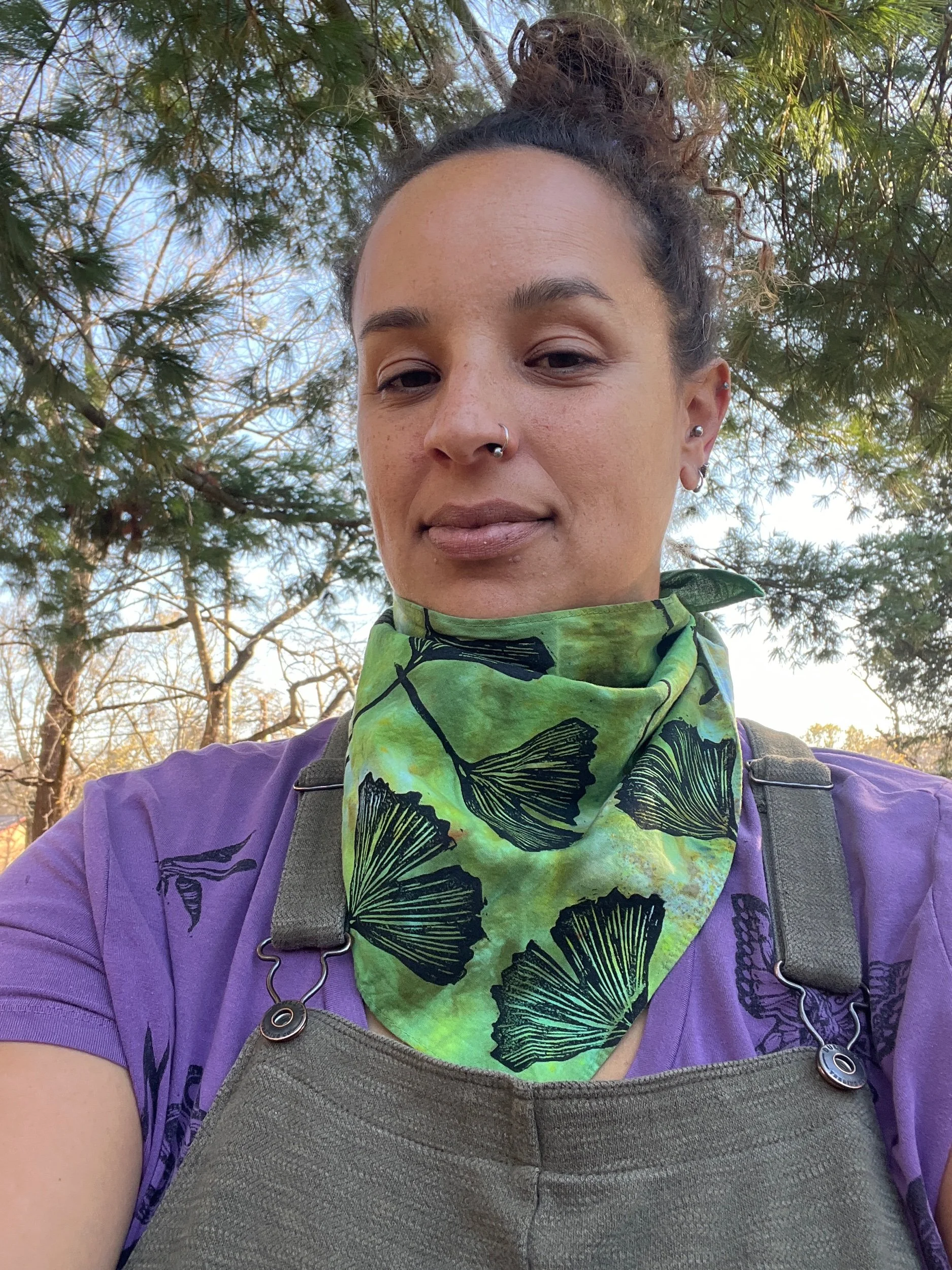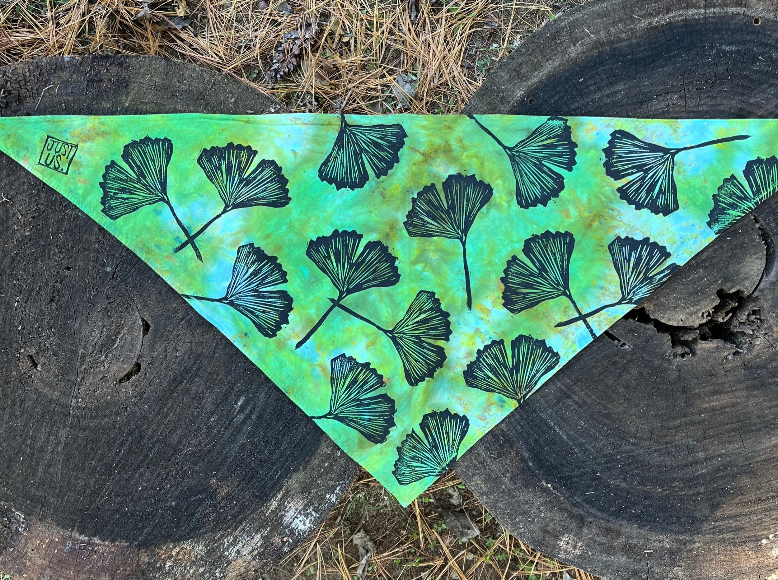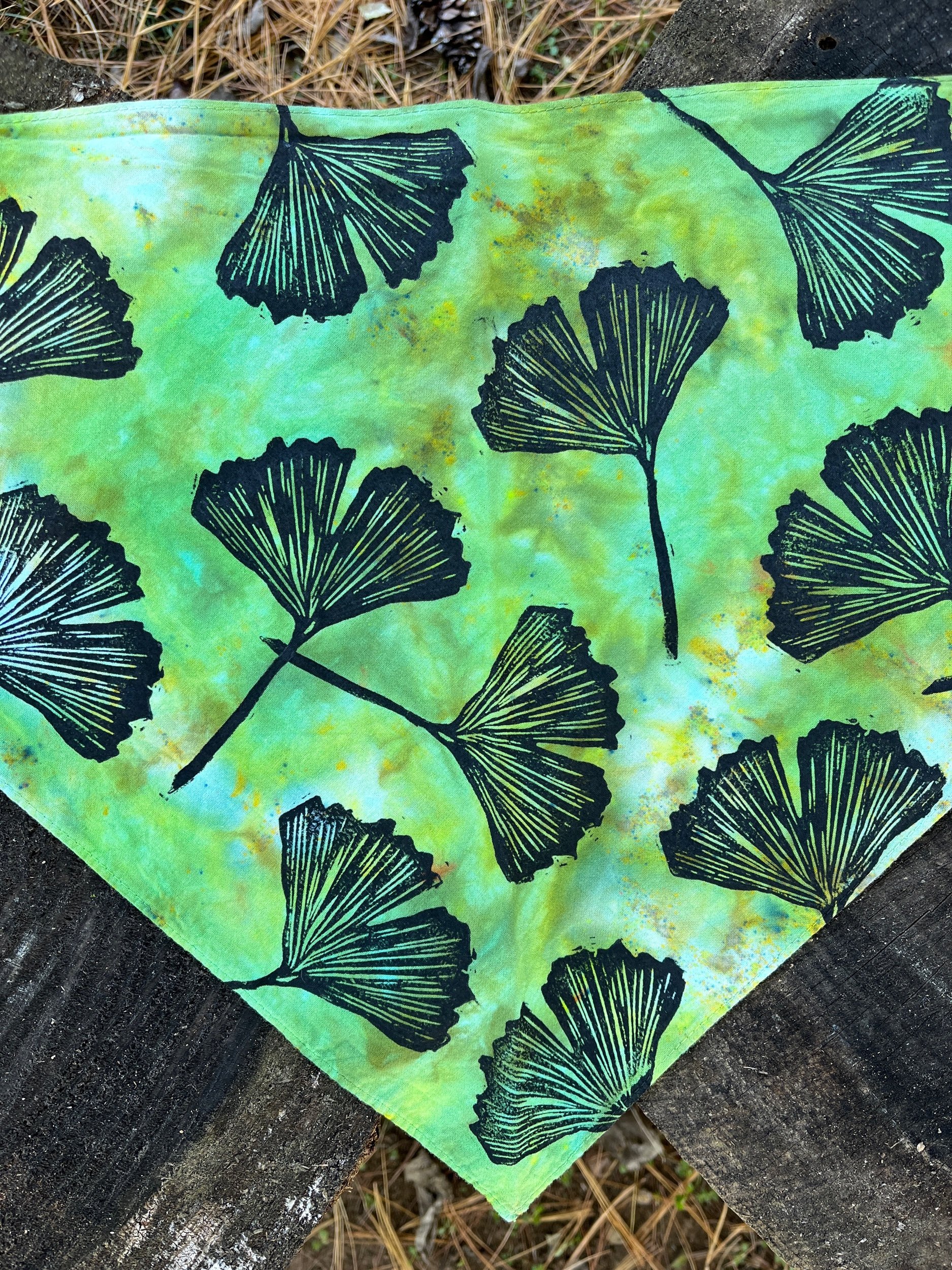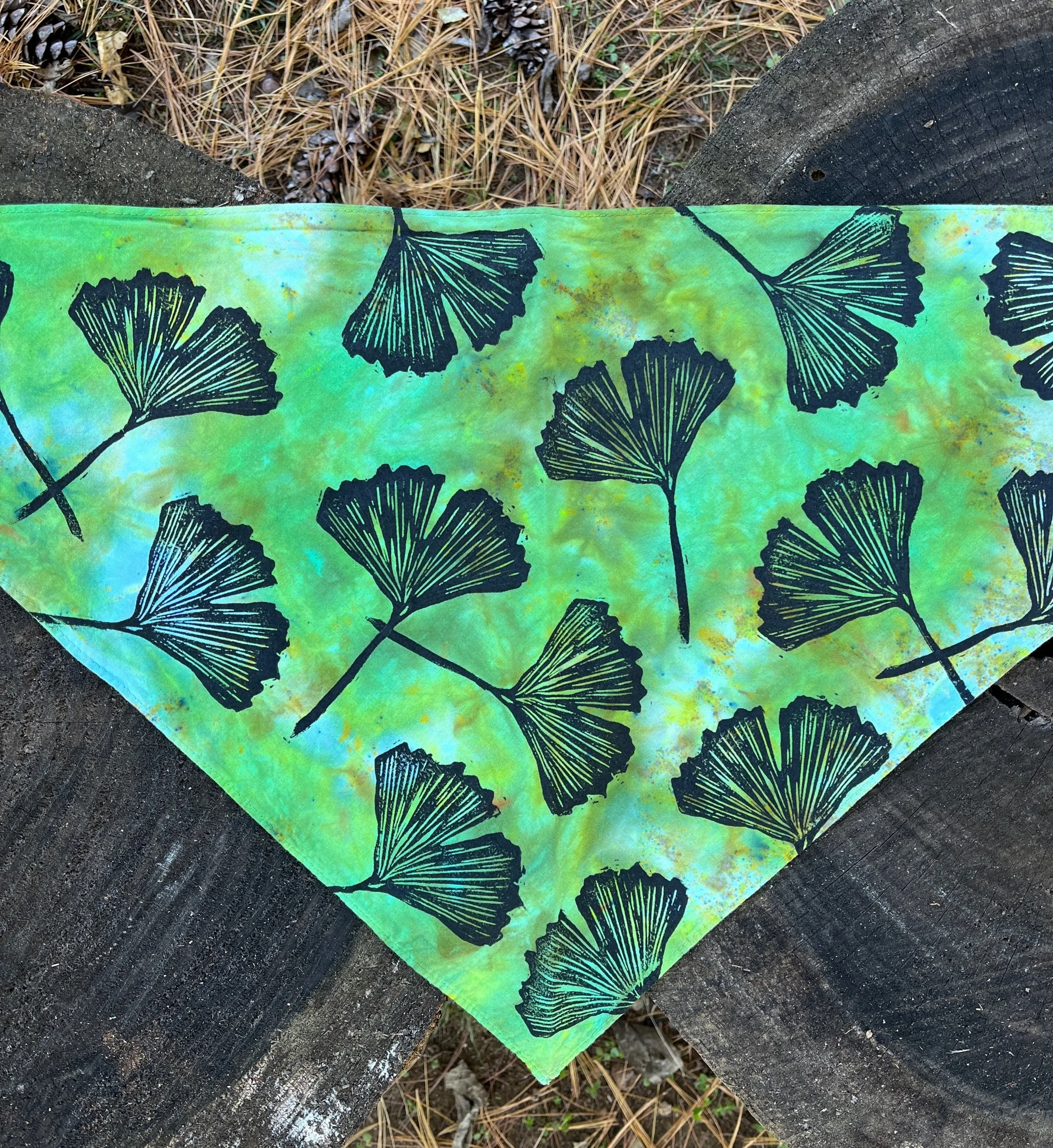 Hand stamped and ice-dyed cotton bandana, 29 x 14 x 20 inches.