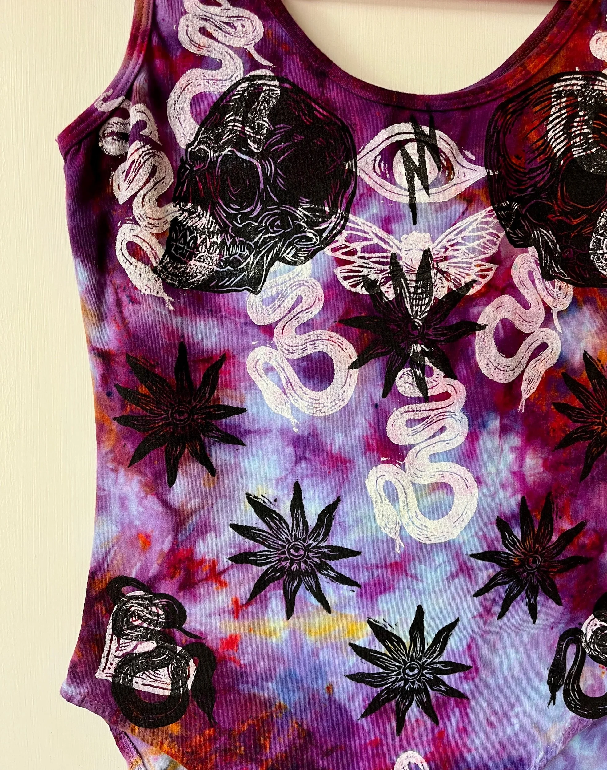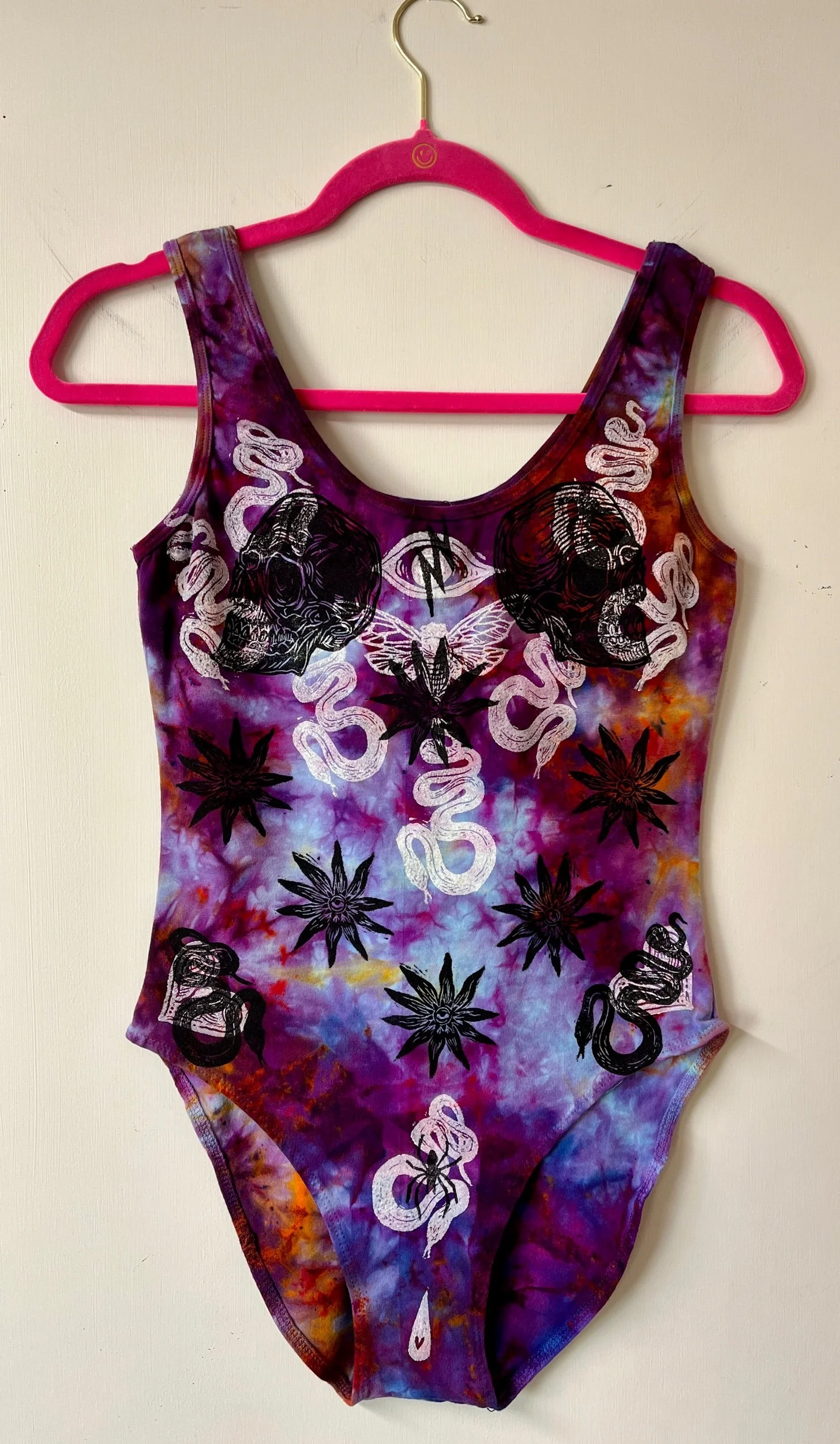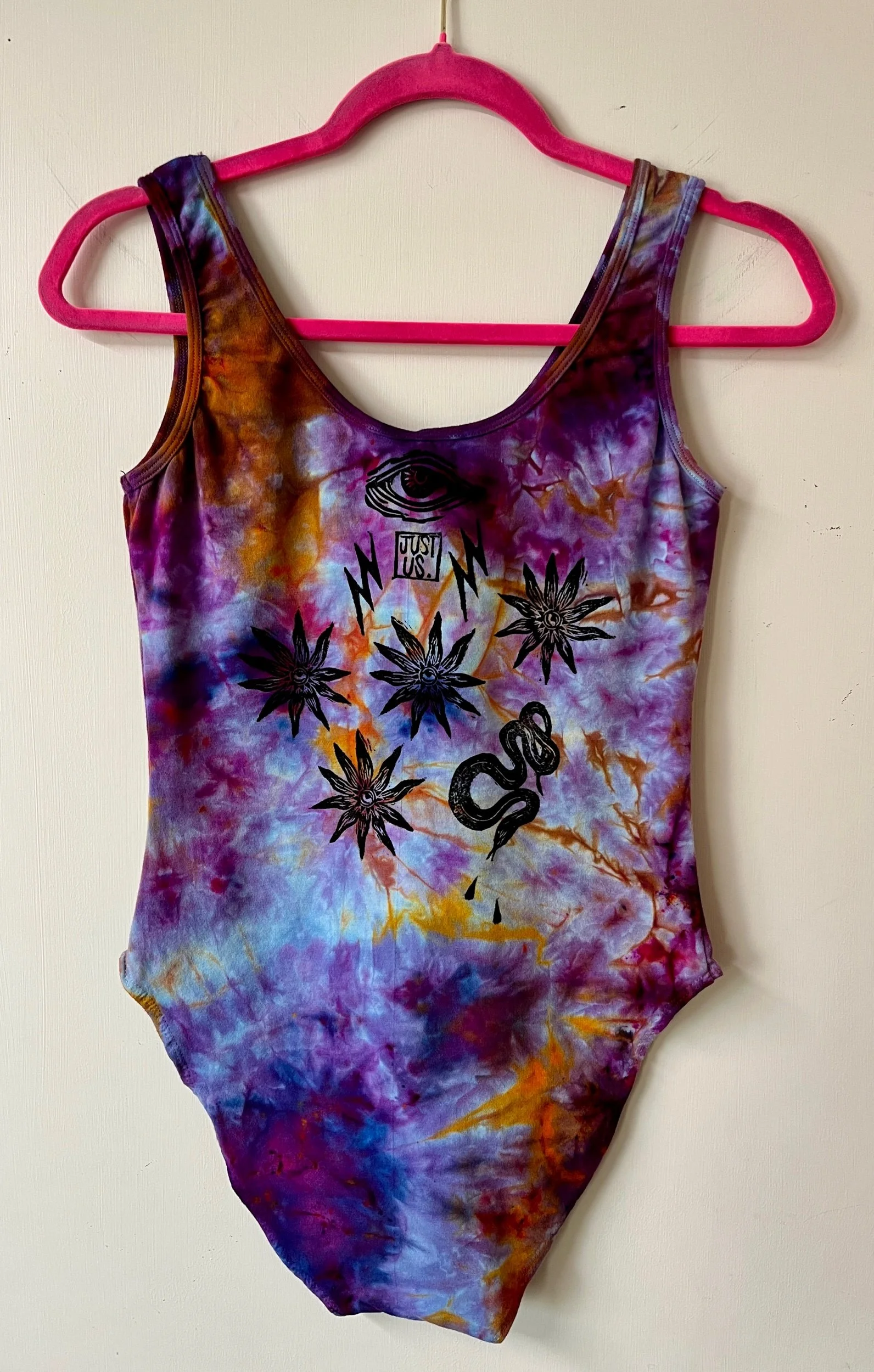 Hand stamped and ice-dyed 92% cotton 8% spandex leotard, size Large- these are nice and stretchy!