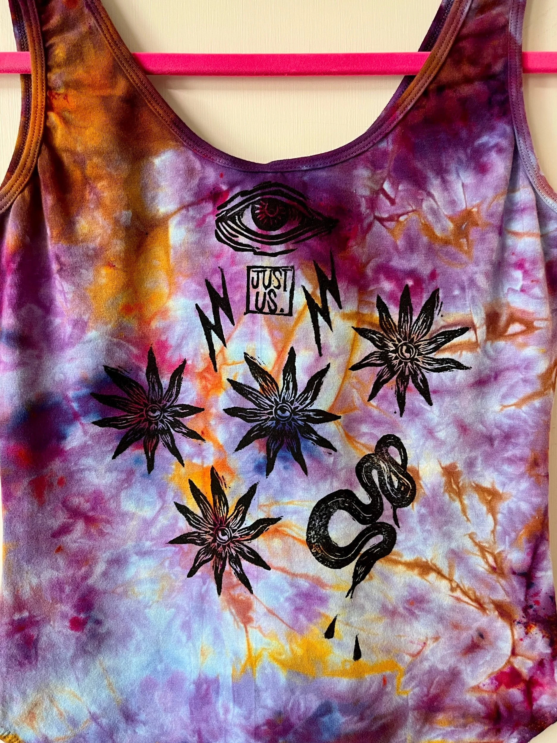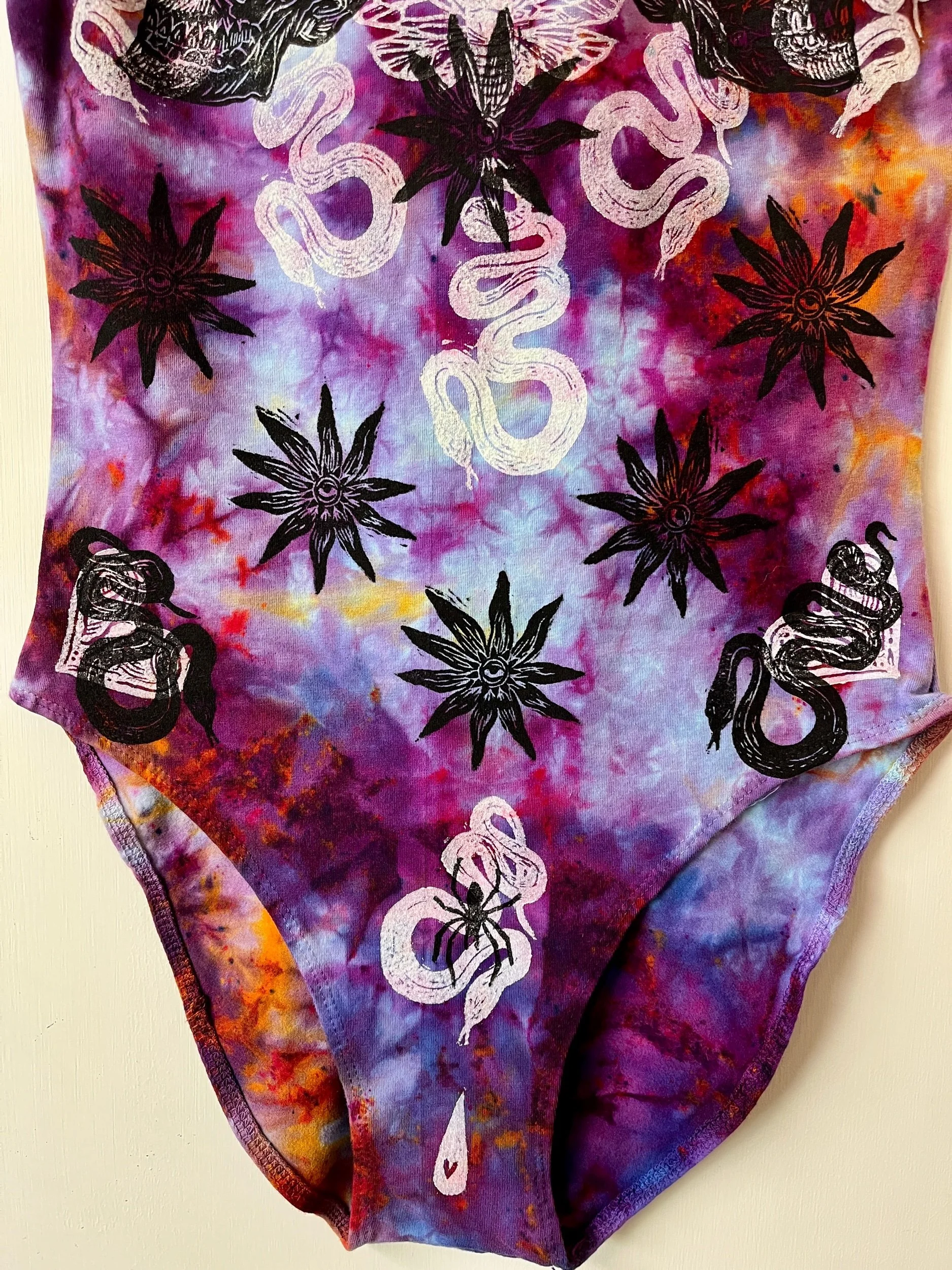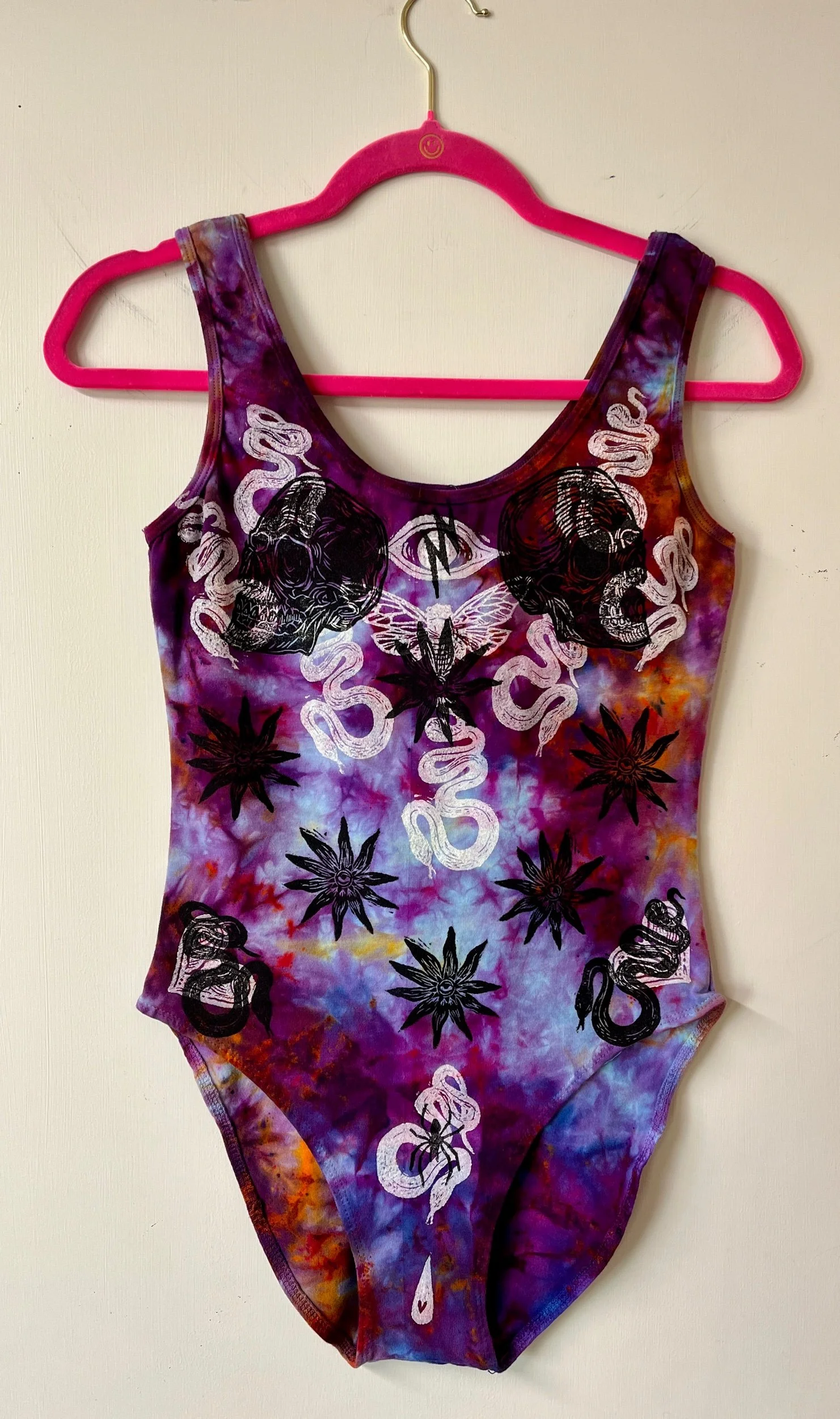 Hand stamped and ice-dyed 92% cotton 8% spandex leotard, size Large- these are nice and stretchy!