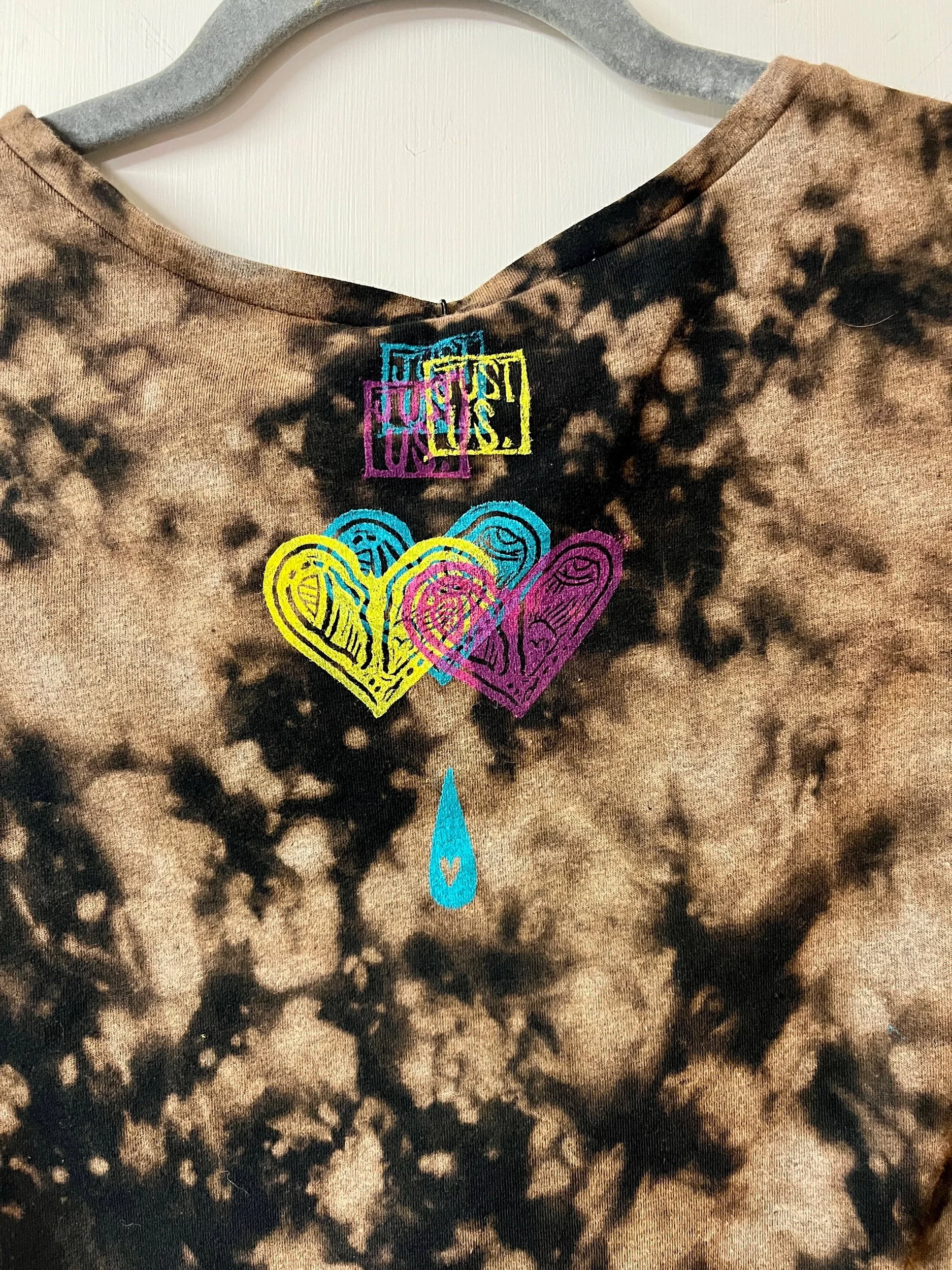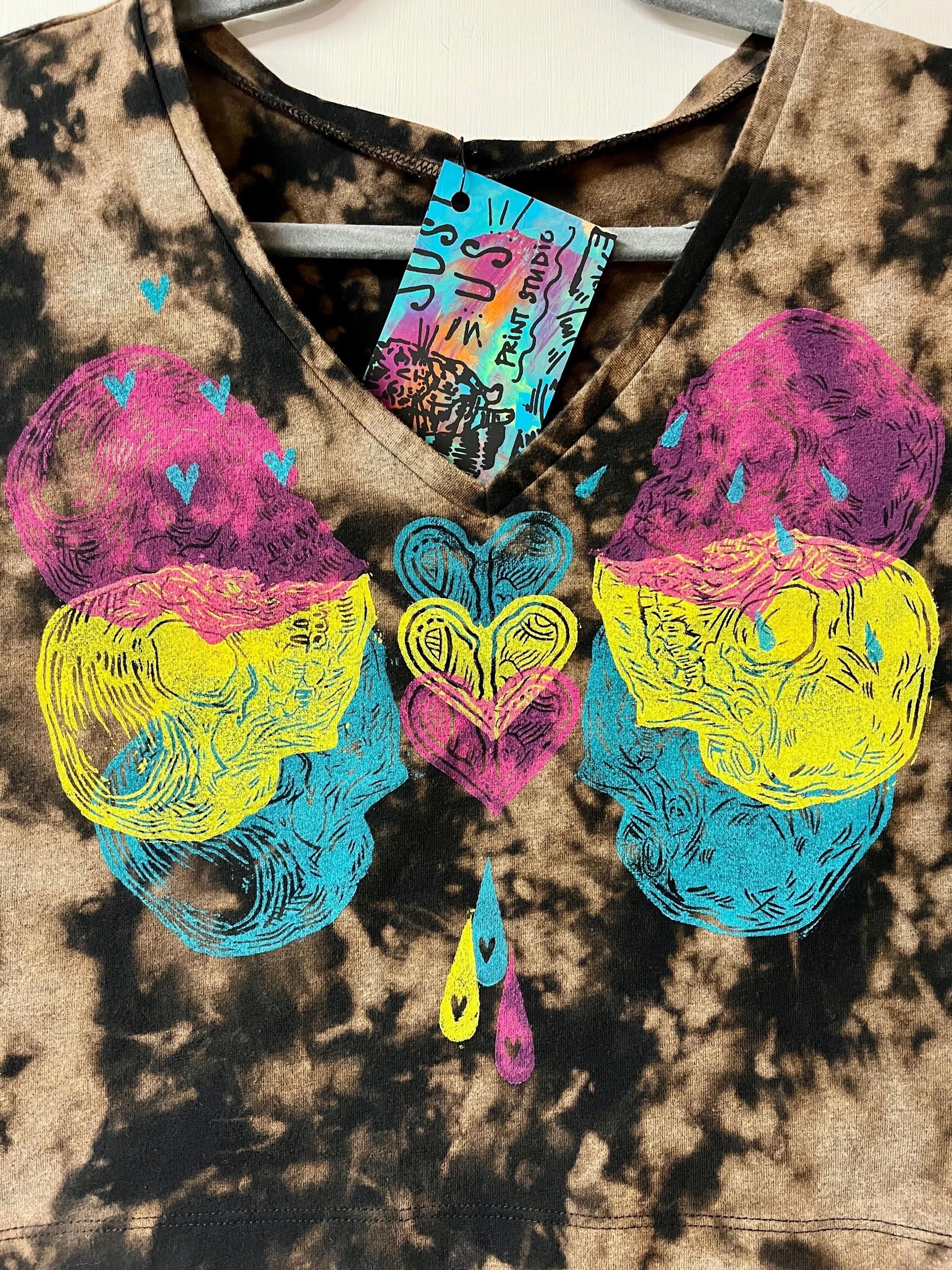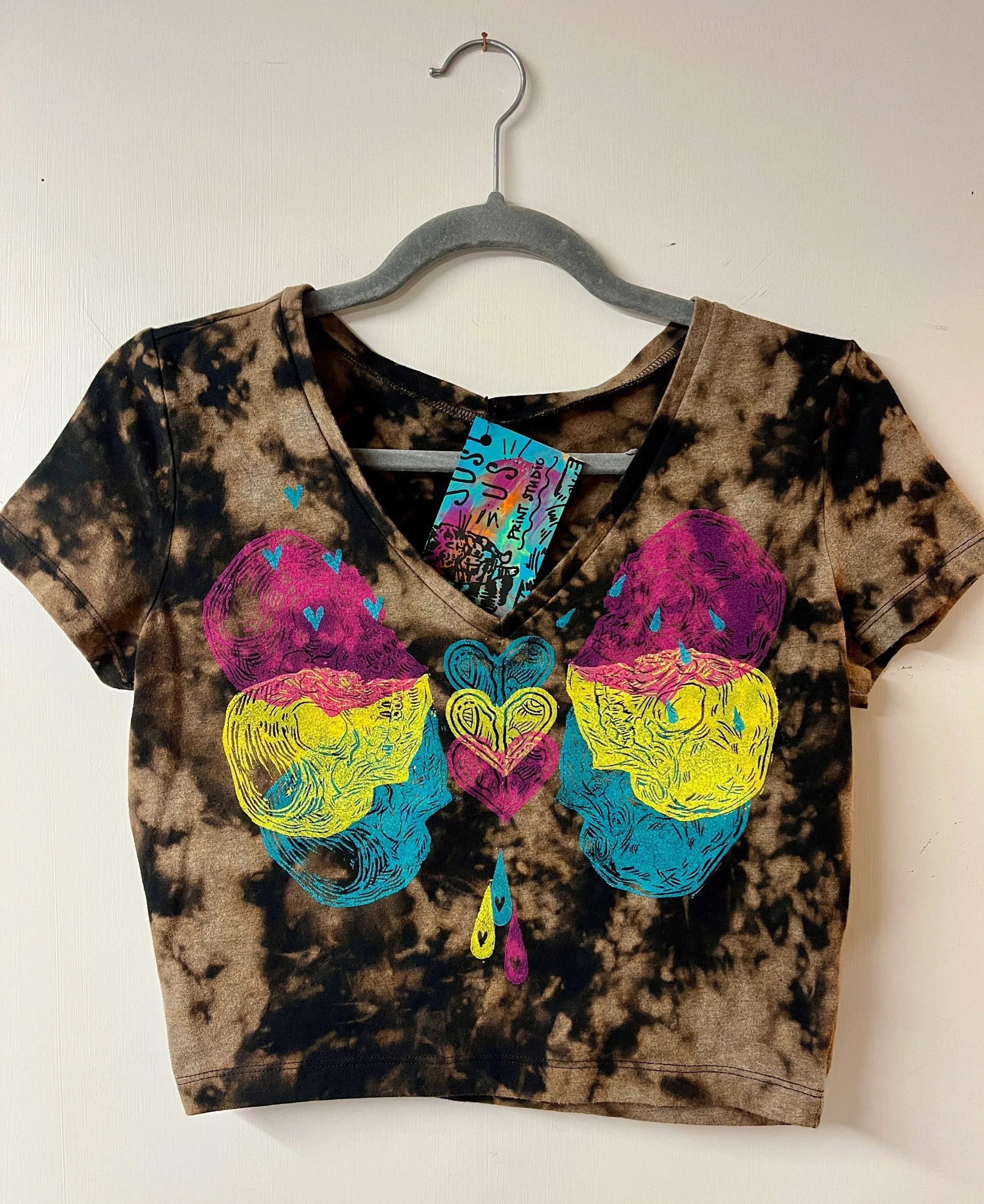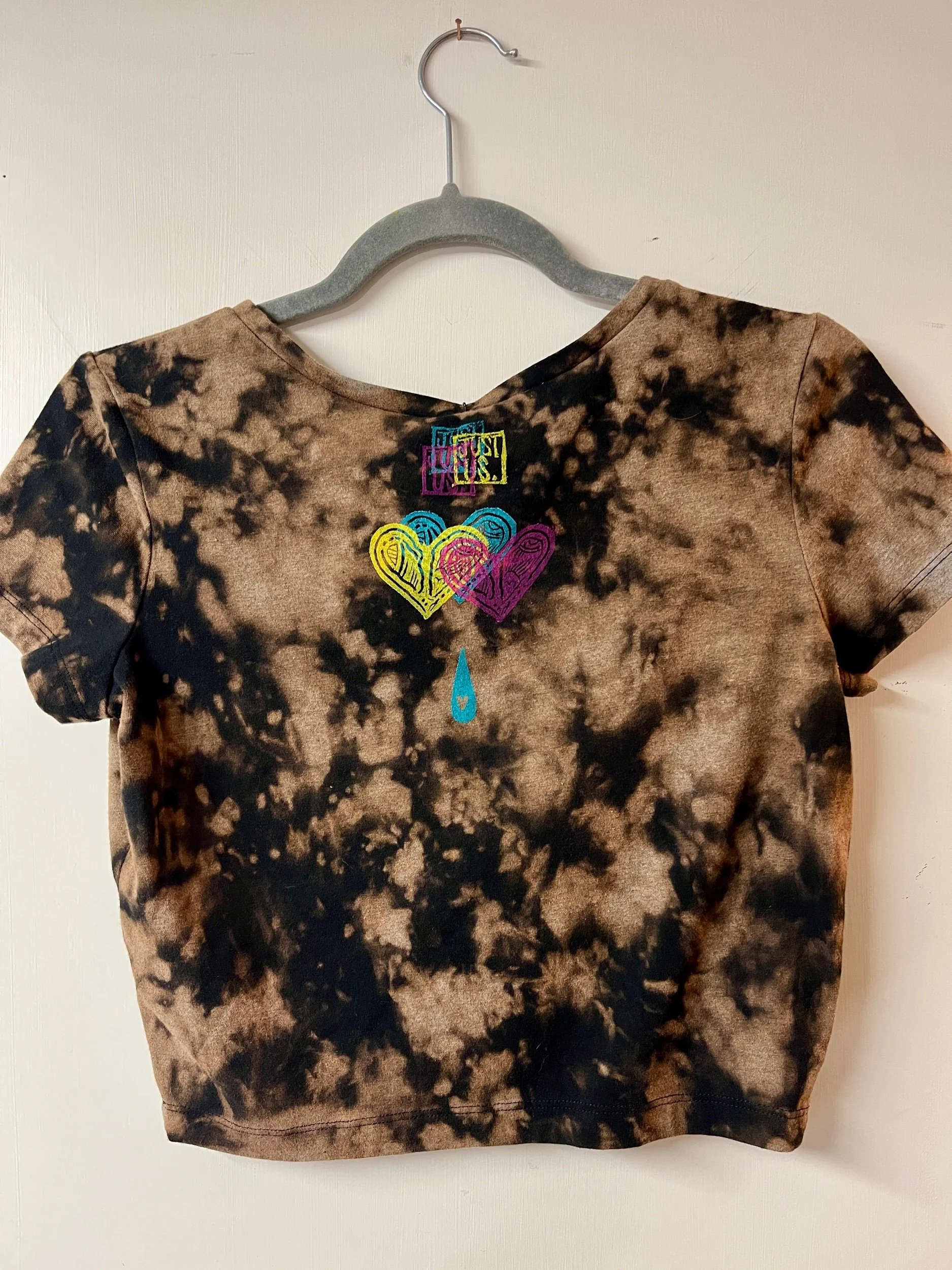 Hand stamped and bleach-dyed cotton v-neck crop tee, fitted size Large.