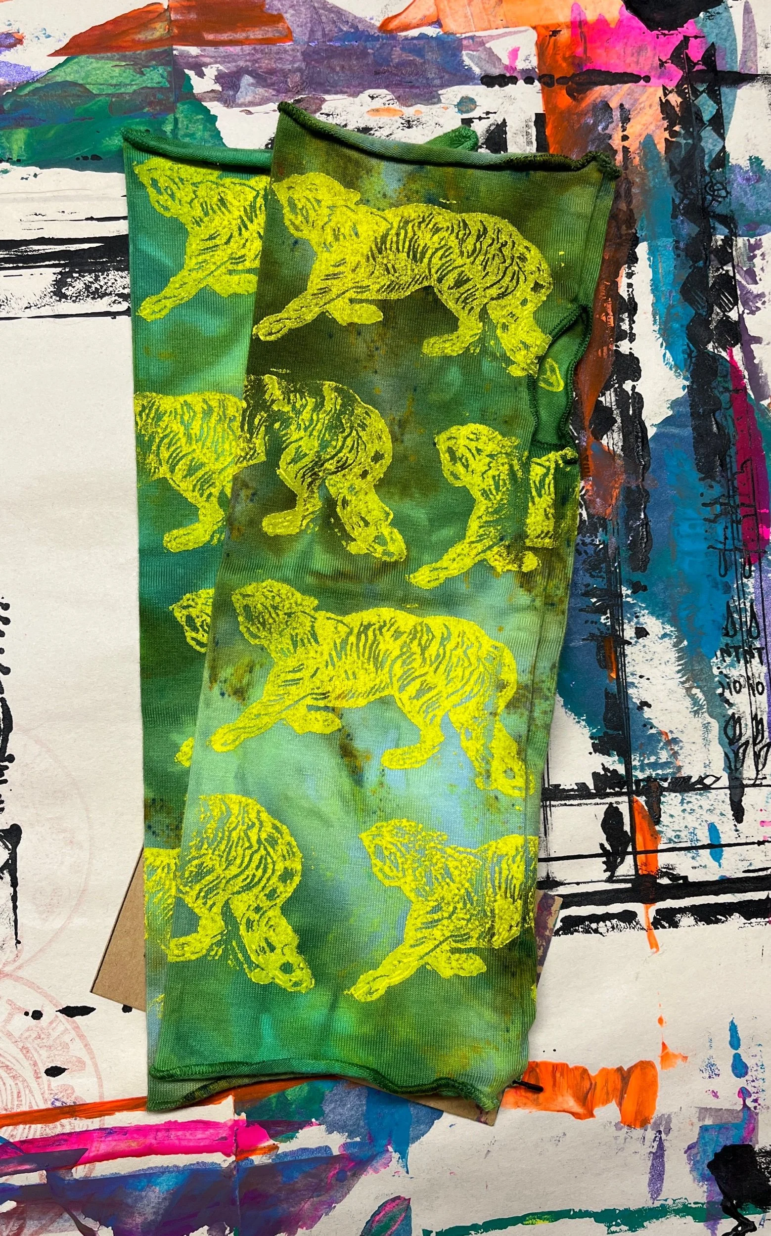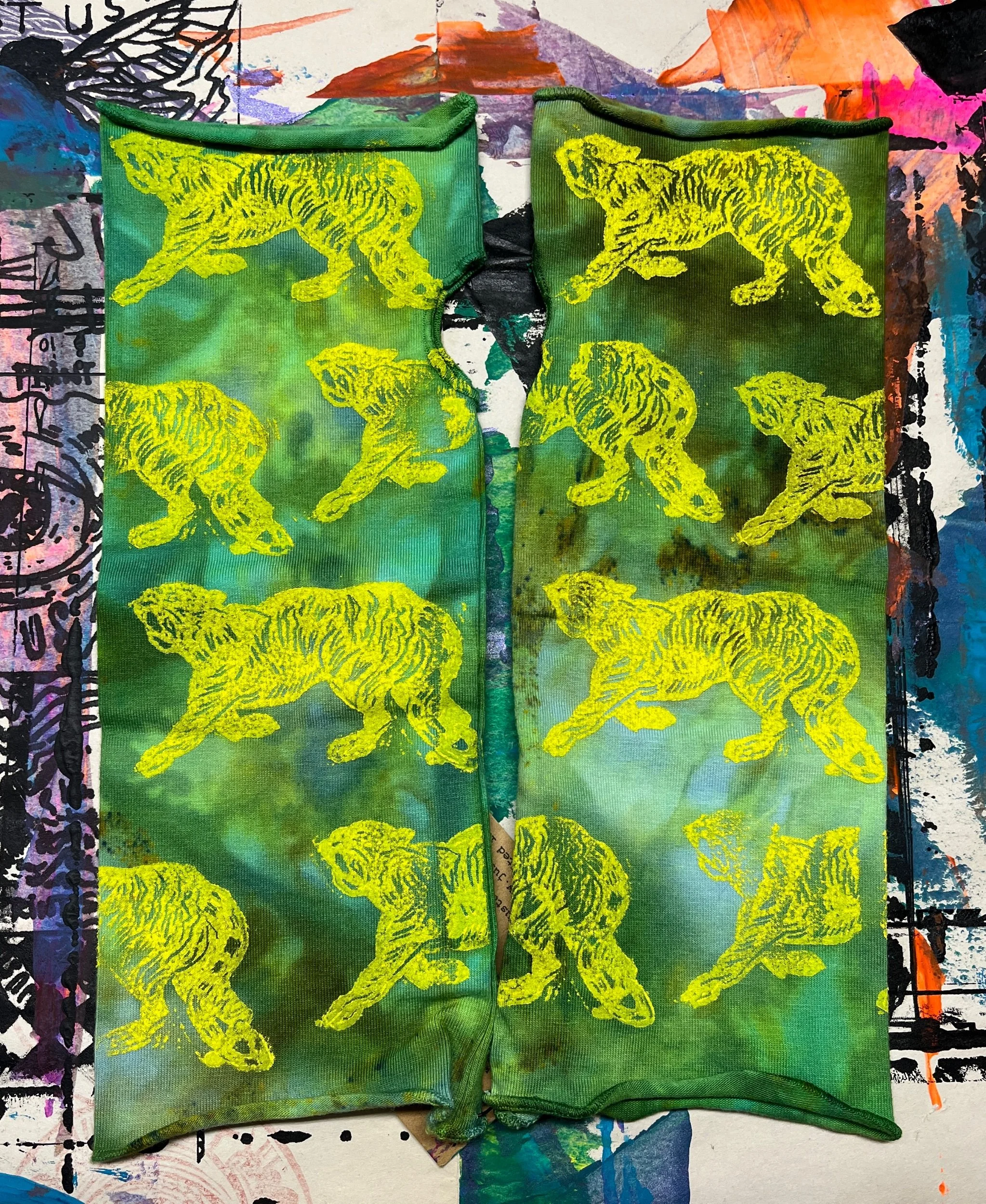 One-of-a-kind, hand stamped and ice-dyed arm warmers, one size.