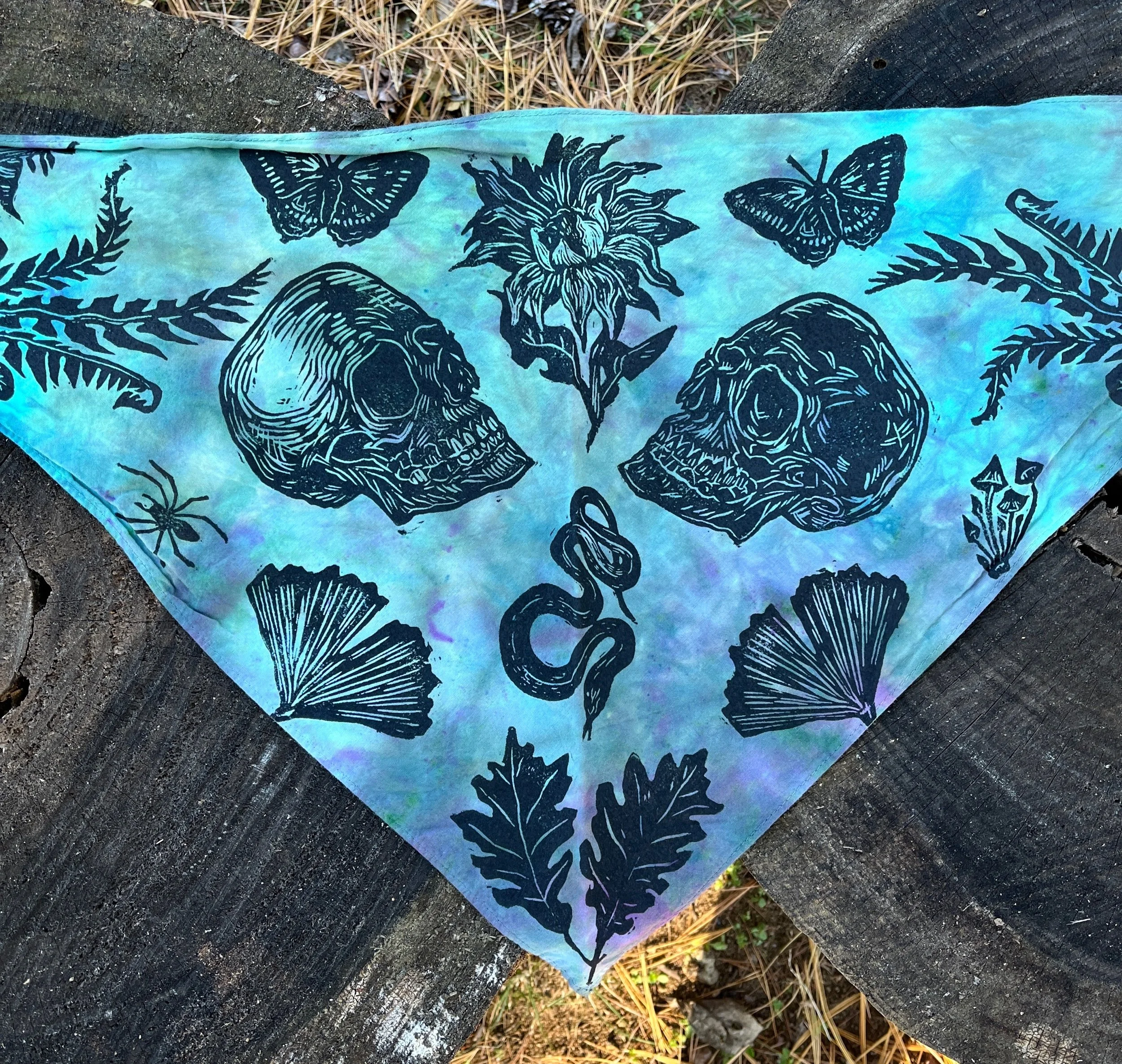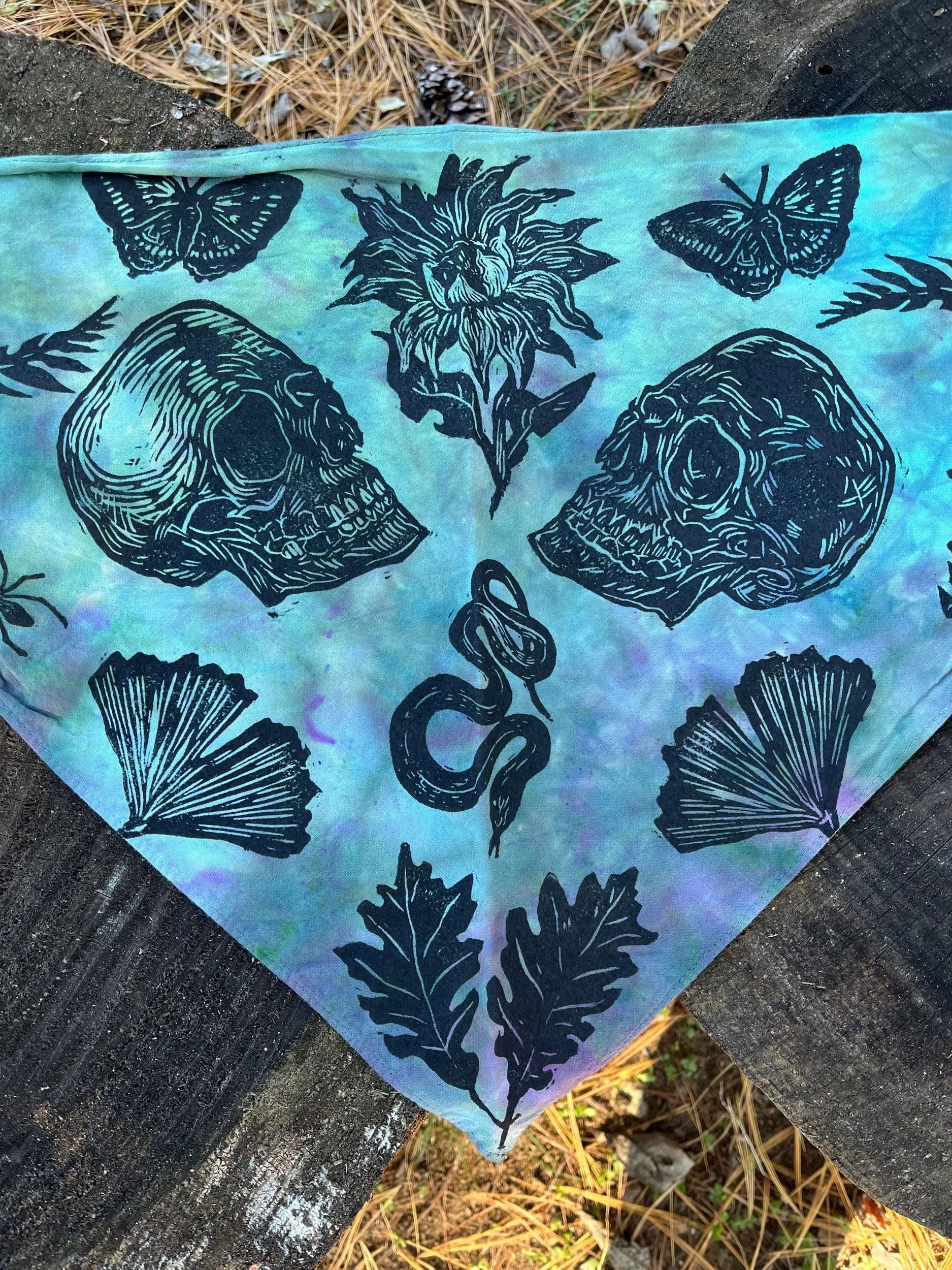 Hand stamped and ice-dyed cotton bandana, 29 x 14 x 20 inches.